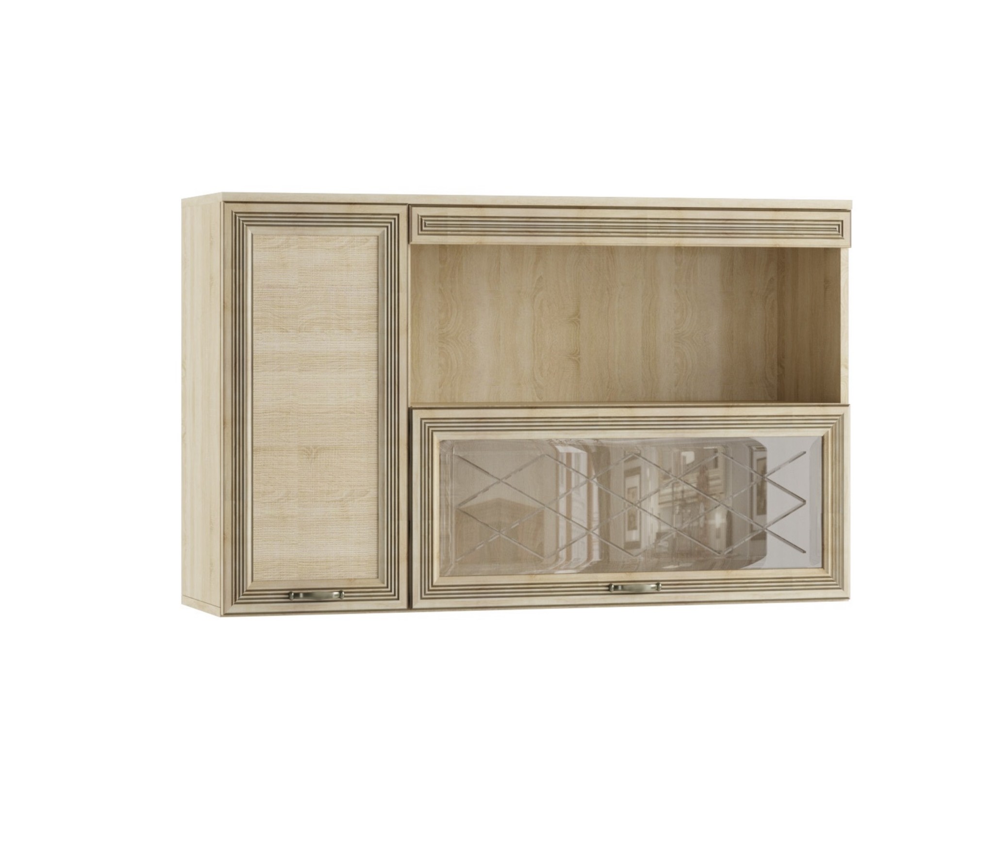 Полка из коллекции Ливорно отличается интересной конструкцией, хорошей вместимостью и очень напоминает навесной шкафчик. Комбинация открытой и закрытых ниш позволит Вам расположить разноплановые вещи: от книг и коробок до предметов декора и сервиза. Полка будет идеально смотреться, Если Вы разместите ее над тумбой под телевизор. Надежные крепления позволят Вам не бояться, что модуль будет перегружен. Особенности: классический стиль нейтральный цвет исполнения хорошая вместимость комбинация открытых и закрытых зон хранения витраж на стеклянном фасаде надежный ЛДСП и крепления рамочный профиль из МДФ фурнитура "старая бронза"