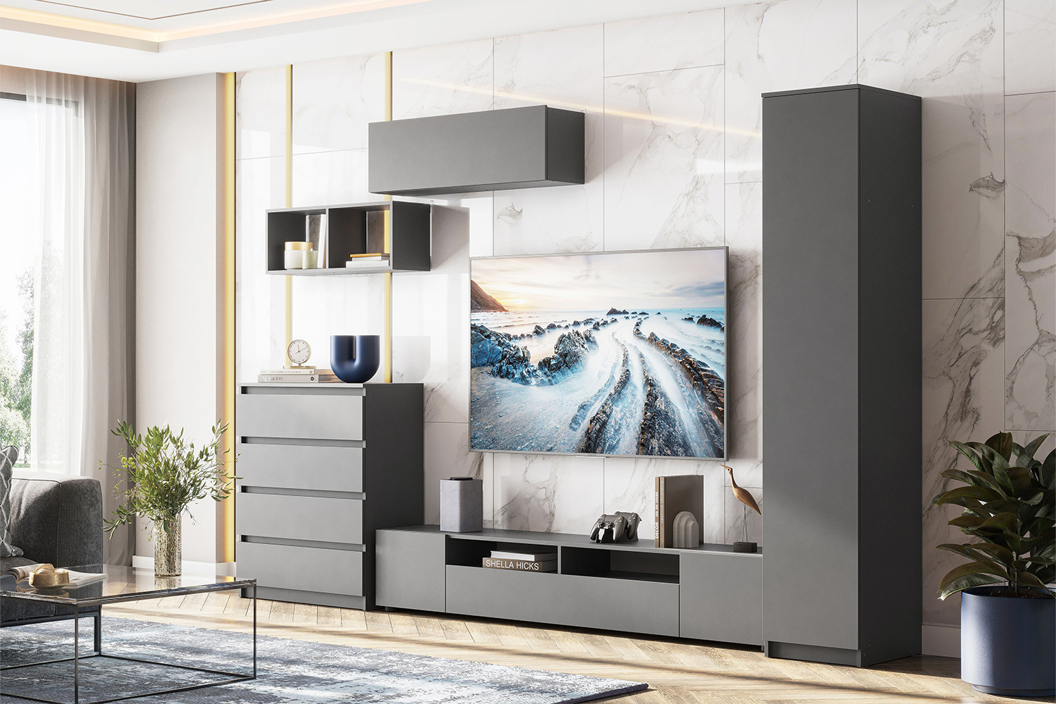 Модульная гостиная Денвер в современном стиле в цвете графит серый - это идеальное решение для тех, кто хочет создать стильный и функциональный интерьер. Она сочетает в себе простоту и элегантность, а также предлагает множество вариантов компоновки. Благодаря модульной системе, вы можете выбрать именно те элементы, которые подходят для вашего помещения. Кроме того, графит серый цвет создает атмосферу спокойствия и уюта, что особенно важно для гостиной. В состав модульной гостиной Денвер могут входить различные элементы: Шкафы. Они могут быть с распашными или раздвижными дверцами. В зависимости от потребностей, можно выбрать шкаф для одежды, книжный шкаф или пенал. Тумба под телевизор. Она оснащена откидной дверкой, внутри перегородка и полки для хранения различных вещей. Комоды. Это классический элемент мебели, который может использоваться для хранения одежды и белья.