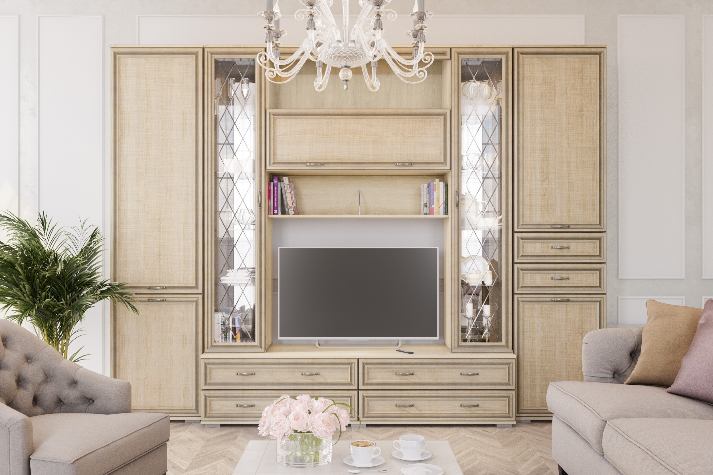 В поисках мебели для гостиной в классическом стиле рекомендуем Вам обратить внимание на коллекцию Ливорно. Всего нескольких модулей будет достаточно, чтобы расположить все Ваши вещи от одежды до сервиза. Разнообразие шкафов, несколько видов тумб и навесных полок - Вы быстро и с комфортом обустроите зону хранения и ТВ-зону. Кроме функциональной составляющей важно отметить и визуальное исполнение мебели. Благодаря универсальному цветовому решению коллекция будет прекрасно смотреться в любом классическом интерьере. Особенности: классический стиль нейтральный цвет исполнения - дуб сонома фасады, декорированные стеклом с узорами надежный ЛДСП и крепления рамочный профиль из МДФ фурнитура "старая бронза"
