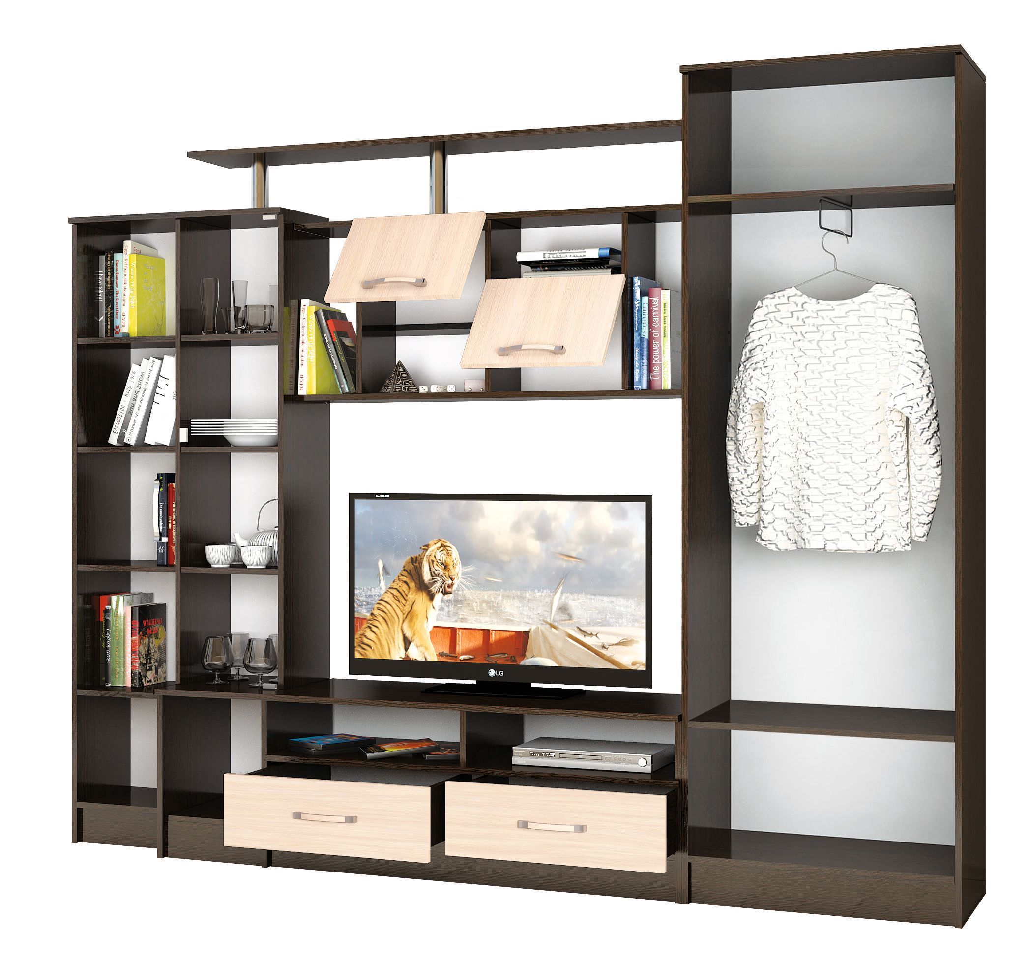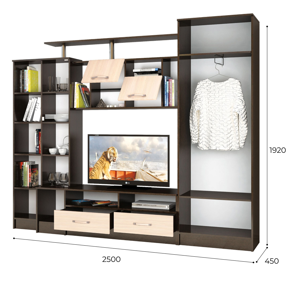 Материал:ЛДСП Paзмеры:1920х2500х450 ТВ-ниша:750х1150 ГостинаяОскар 5обладает отличной функциональностью и комфортом при ежедневной эксплуатации. Эти необходимые свойства обеспечивает наличие нескольких вместительных секций, позволяющих с удобством разместить все нужные вещи. Продуманное цветовое решение мебели гарантирует ее совместимость с практически любым современным интерьером.