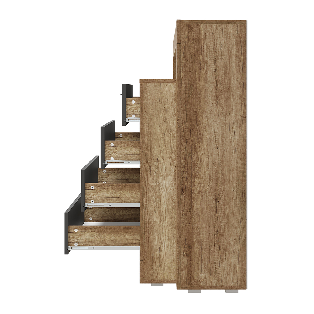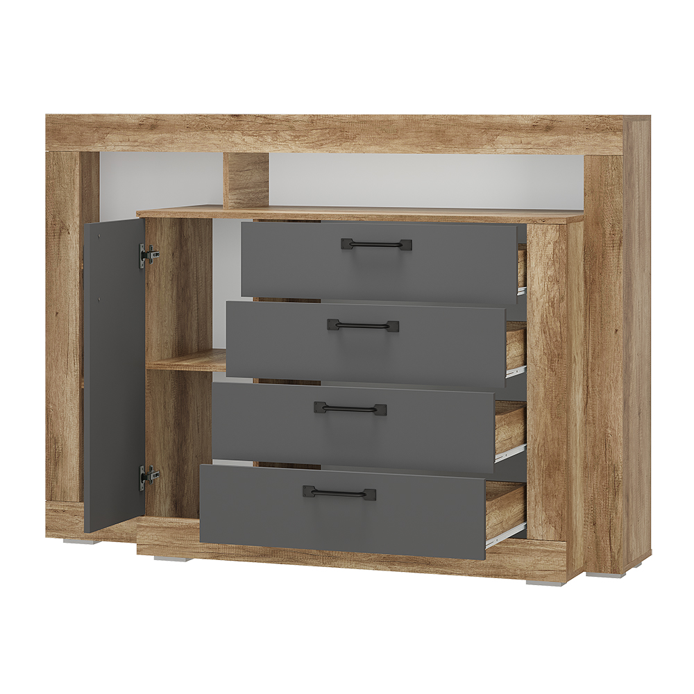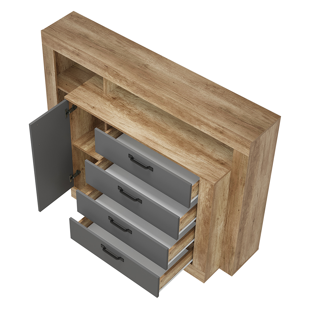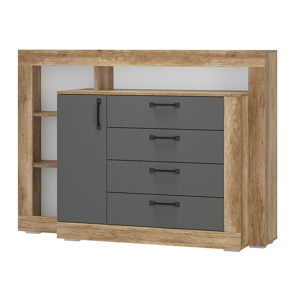 Новая модульная коллекция Прима в актуальном декоре дуб каньон/графит удачно впишется в современную обстановку Вашей квартиры и позволит организовать грамотное хранение вещей в гостиной и спальне. Приятный древесный оттенок корпуса гармонично дополнен матовым графитом, в котором исполнены фасады. Оригинальный комод КМ-17 оснащен 4-мя выкатными ящиками на роликовых направляющих и комплектом полок. Особенности цвет корпуса/цвет фасада - дуб каньон/графит сборка не универсальная стильная лицевая фурнитура роликовые направляющие на ящиках