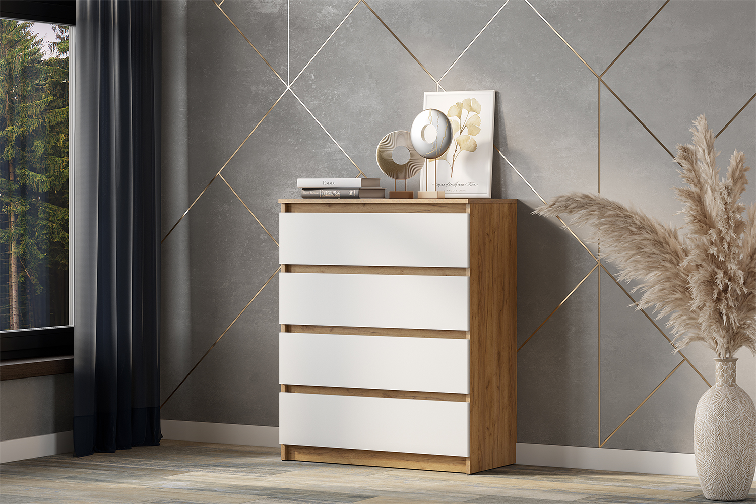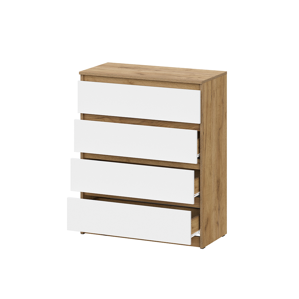 Комод с ящиками из модульной серии Денвер дополнит современный и сканди интерьер. Четыре вместительных ящика позволят организовать идеальное место хранения. Благодаря своим размерам, комод помещается в любую комнату, не занимая много места. Он добавит функциональности в ваш дом, а также поможет поддерживать порядок даже в офисе. Особенности: - Материал корпуса: ЛДСП - Материал фасада: ЛДСП - Направляющие ящиков: Роликовые - Скрытая фурнитура