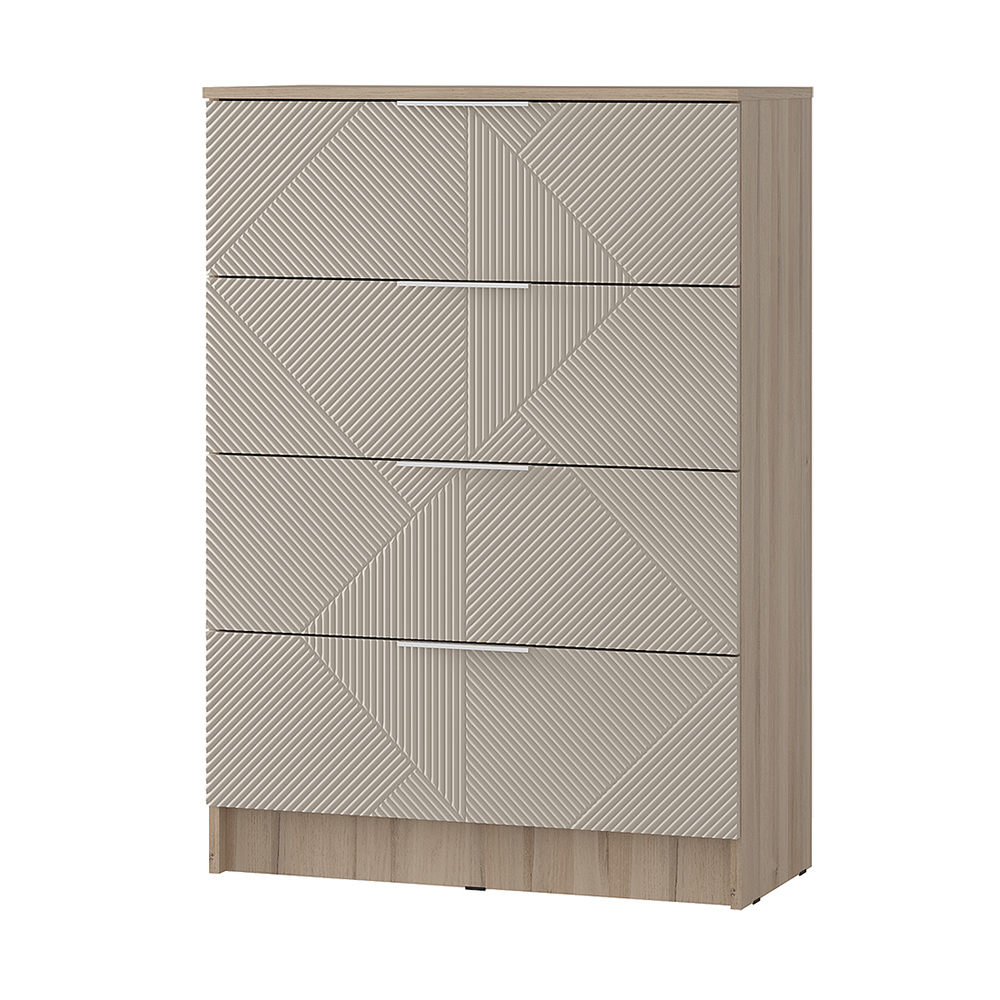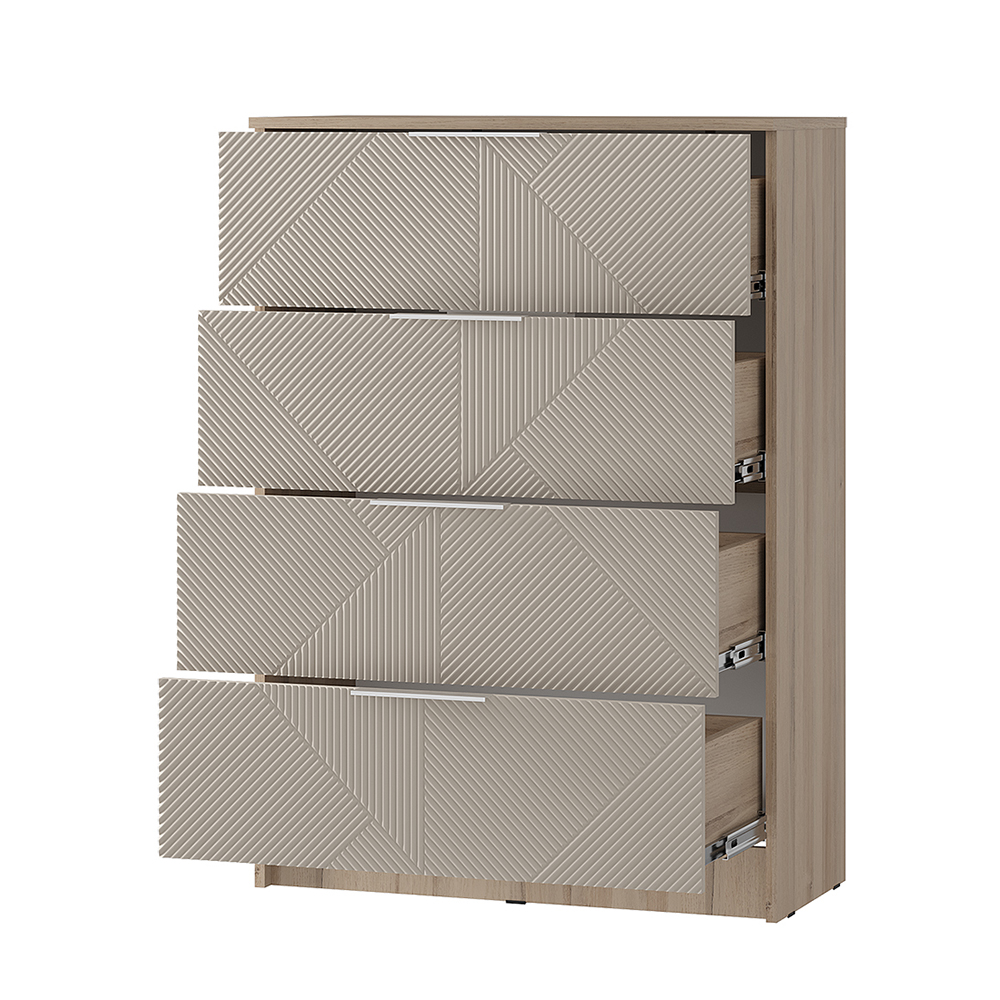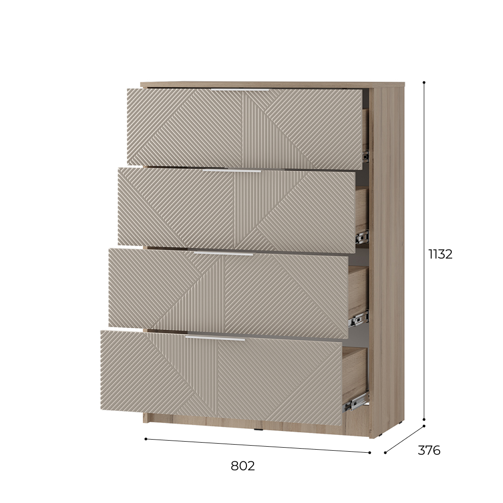 Компактный комод Эмилия с выкатными ящиками украсит ваш дом. Лаконичные модели из данной серии украшены изысканной фрезеровкой, а приглушенная цветовая гамма легко впишется в современный интерьер. Разнообразие модулей позволит подобрать идеальный комплект для вашей гостиной. Особенности: эффектные торцевые ручки-язычки фрезеровка на фасадах МДФ направляющие ящиков шариковые максимальная нагрузка на крышку 10 кг максимальная нагрузка на ящик 5 кг