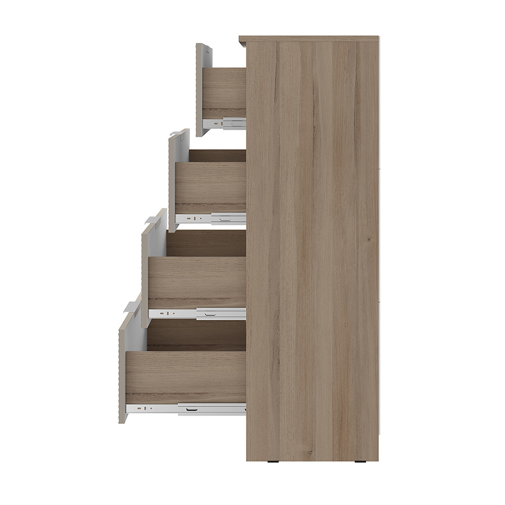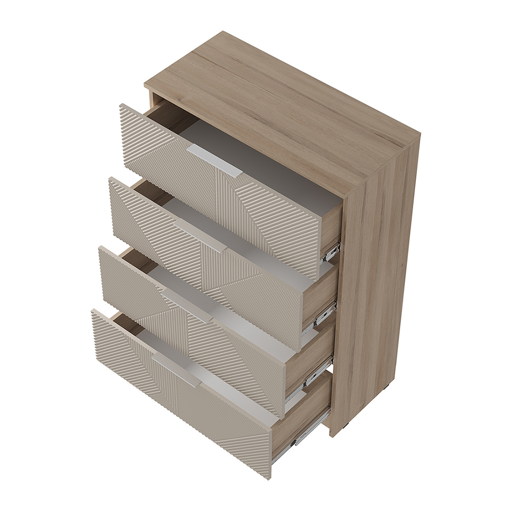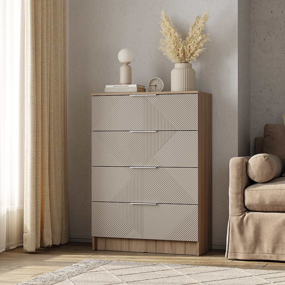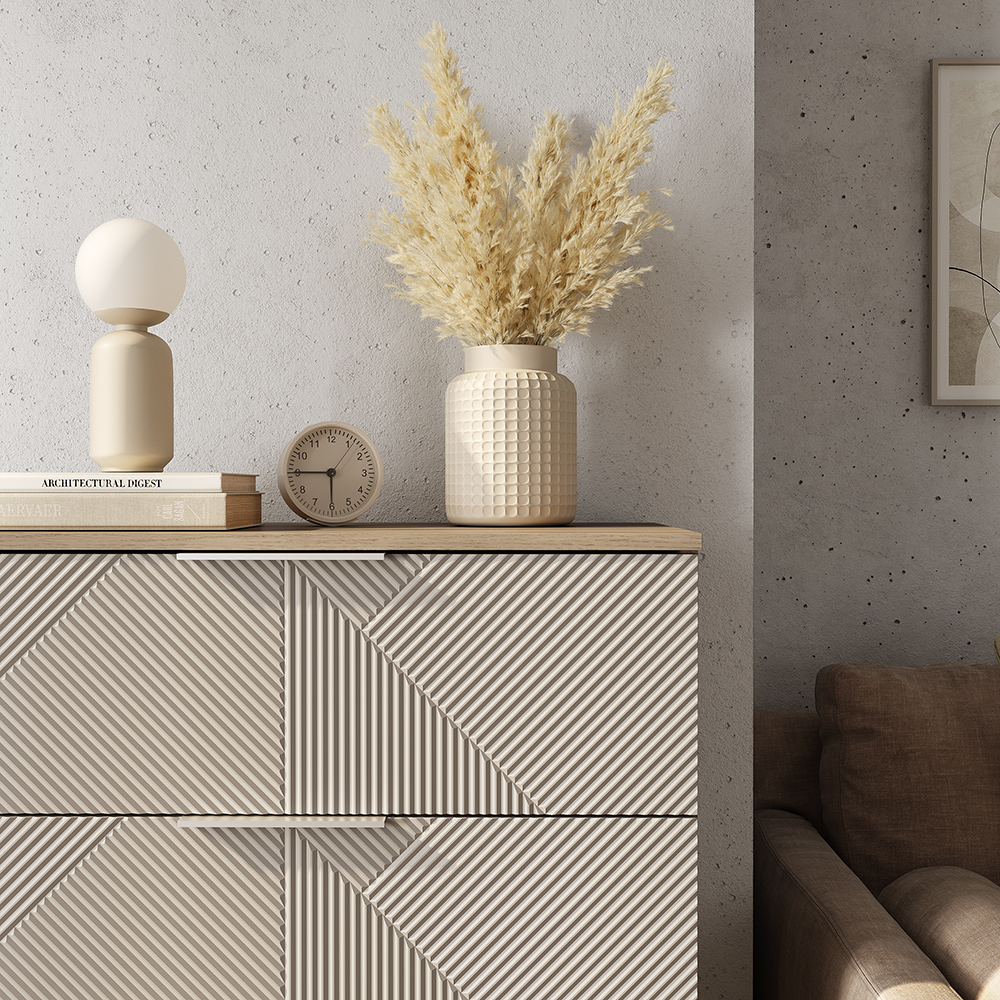 Компактный комод Эмилия с выкатными ящиками украсит ваш дом. Лаконичные модели из данной серии украшены изысканной фрезеровкой, а приглушенная цветовая гамма легко впишется в современный интерьер. Разнообразие модулей позволит подобрать идеальный комплект для вашей гостиной. Особенности: эффектные торцевые ручки-язычки фрезеровка на фасадах МДФ направляющие ящиков шариковые максимальная нагрузка на крышку 10 кг максимальная нагрузка на ящик 5 кг