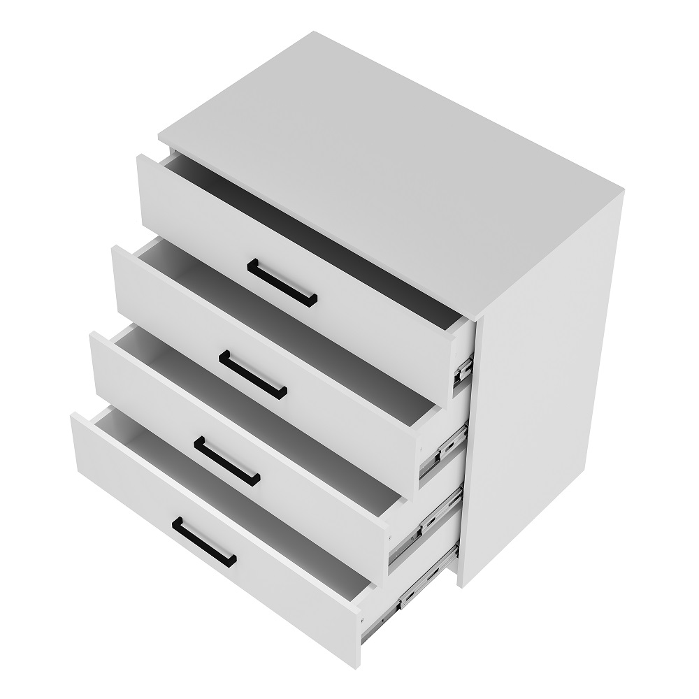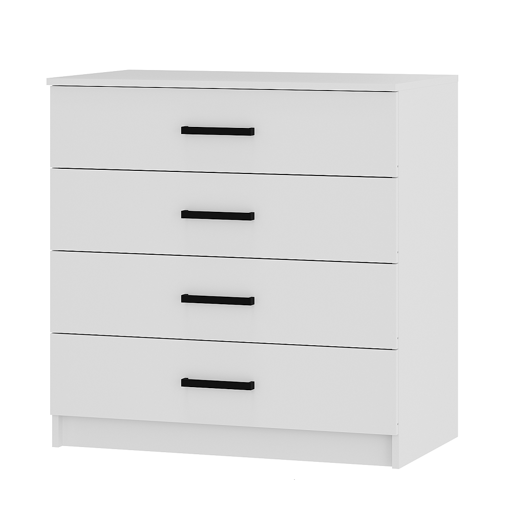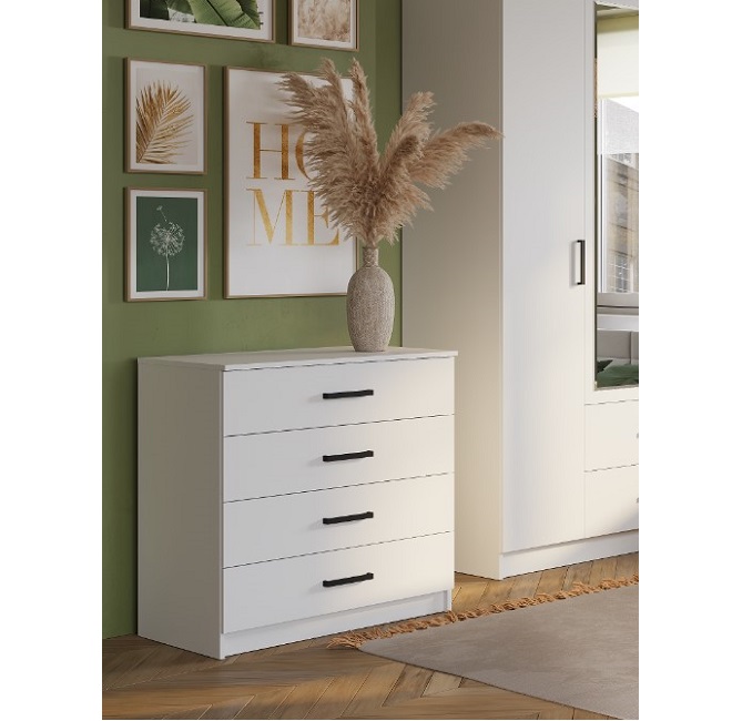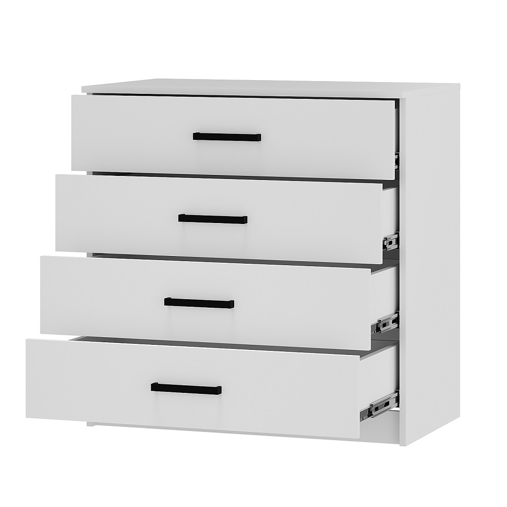 Коллекция мебели для спальни Фьюжн является воплощением эстетики минимализма. Белый цвет в сочетании с черной фурнитурой, строгие линии, простой конструктив – все это лучшие черты мебельного дизайна. Широкий комод с 4-мя ящиками на направляющих плавного выдвижения поможет организовать хранение вещей в сложенном виде, постельных принадлежностей, аксессуаров. Особенности материал корпуса/фасада – ЛДСП белый шариковые направляющие полного, плавного и бесшумного выдвижения стильные и удобные ручки
