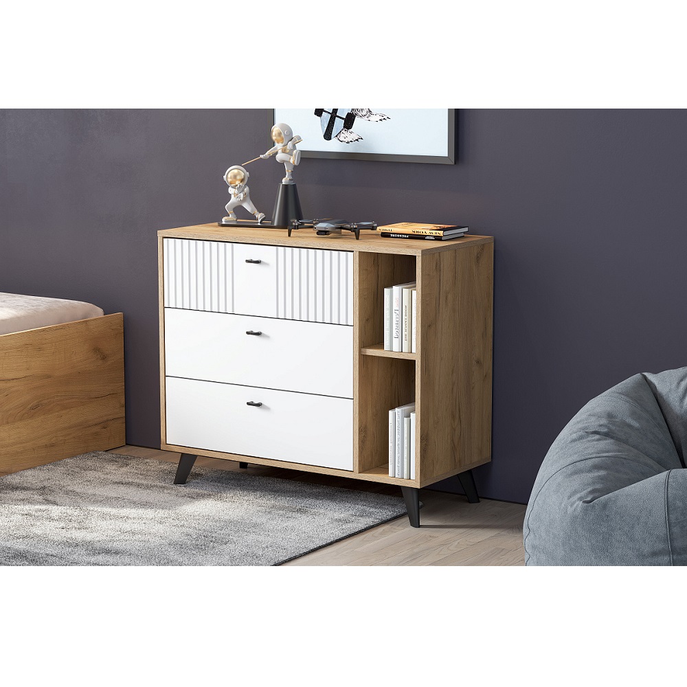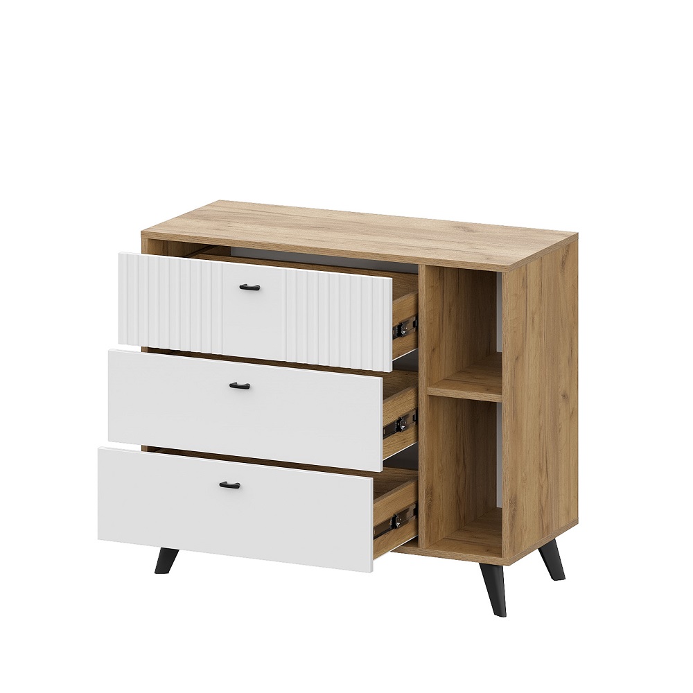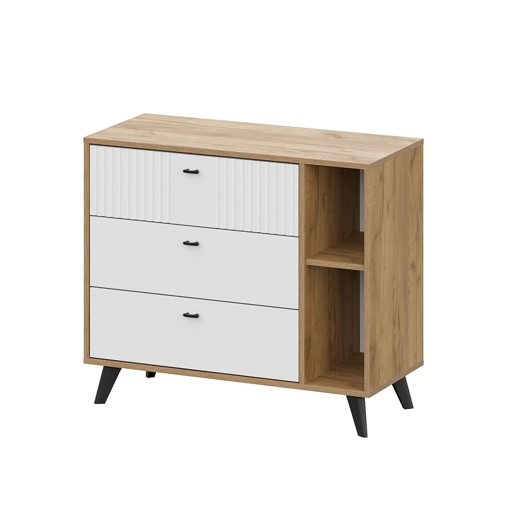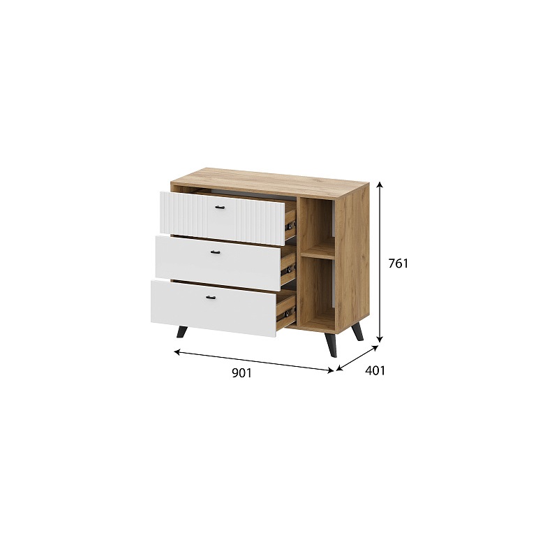 Аккуратный комод с ящиками Милан - универсальное решение для любой по функционалу комнате. Не займет много места, позволит разместить одежду, аксессуары, книги и предметы декора. Особенности корпус ЛДСП дуб золотой фасад МДФ в пленке ПВХ белый матовый фурнитура в комплекте стильные черные опоры шариковые направляющие полного, плавного и бесшумного выдвижения на ящиках