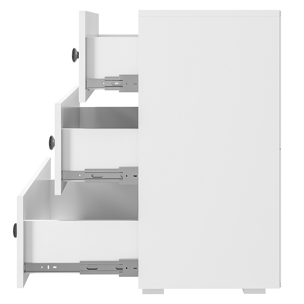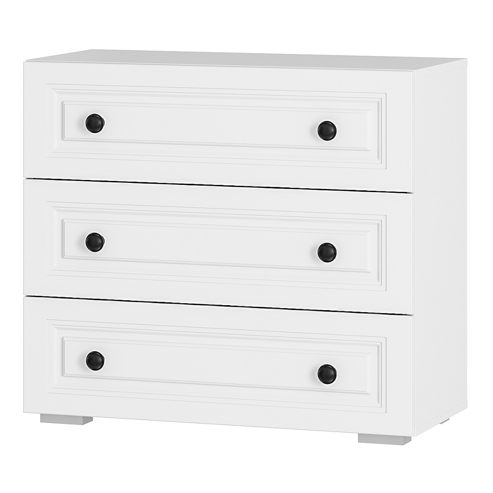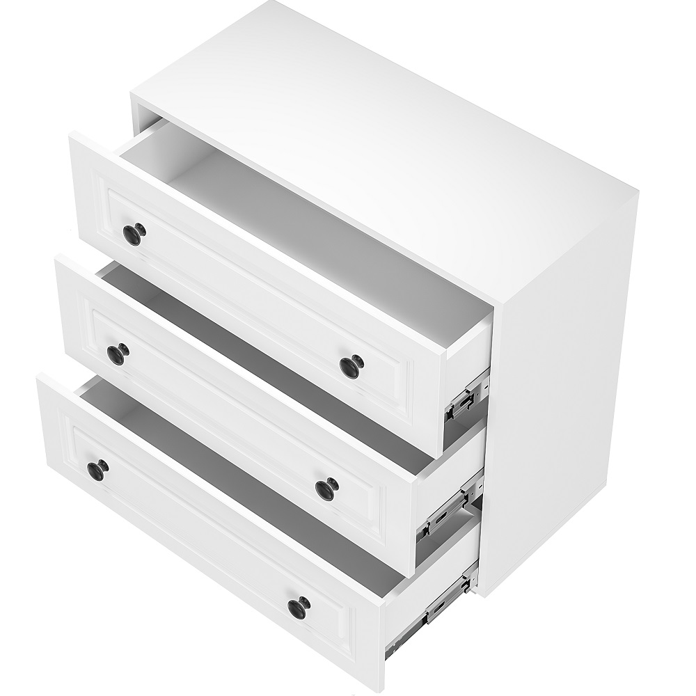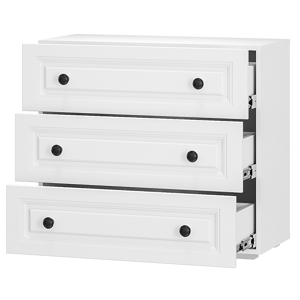 Комод Софт КМ-01 - это сочетание стильного дизайна и безупречной функциональности. Три выдвижных ящика помогут организовать место хранения аксессуаров и белья. Металлические ручки и актуальная фрезеровка фасадов впишутся в современный дизайн интерьера. Особенности корпус ЛДСП, белый фасад МДФ, эмаль белая задняя стенка - ЛДВП, белая 0,4 мм кромка ПВХ пластик 0,7 мм опоры подпятник, пластик шариковые направляющие плавного выдвижения черные, металлические ручки max нагрузка на ящик- 5 кг