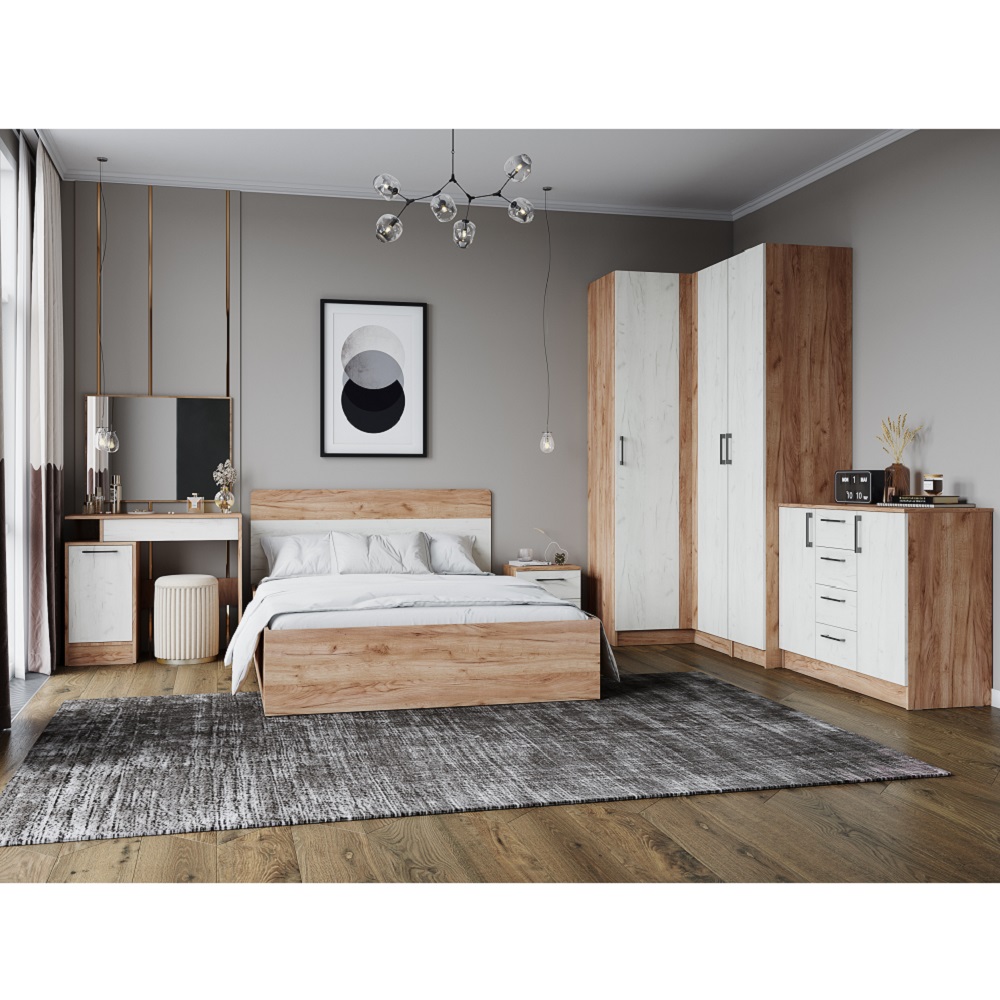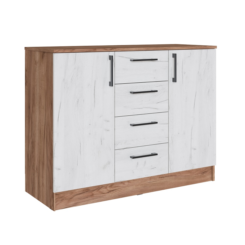Комод Вегас - прекрасное решение хранения вещей, аксессуаров и белья в спальне. Комод оснащен двумя створками с полкам и четырьмя выдвижными ящиками. Лаконичный дизайн и простые формы впишутся как в яркий, так и в спокойный дизайн комнаты. Особенности корпус ЛДСП, дуб крафт табачный фасад ЛДСП, дуб крафт белый петли без доводчика «Boyard» опора подпятник направляющие роликовые