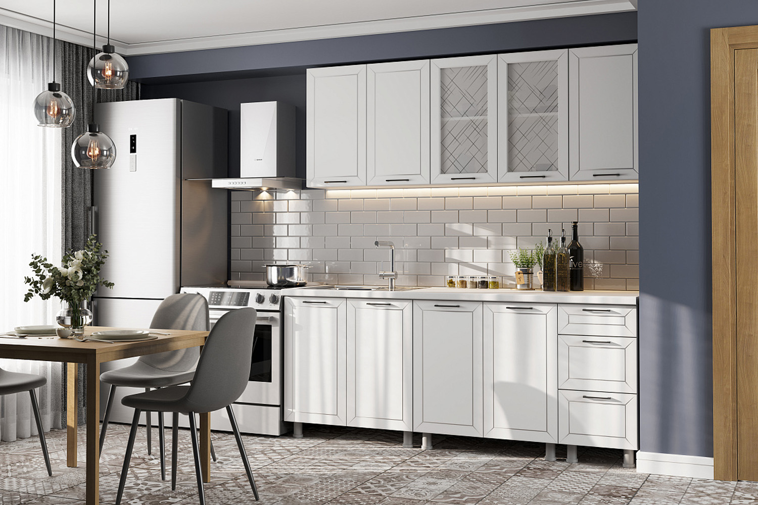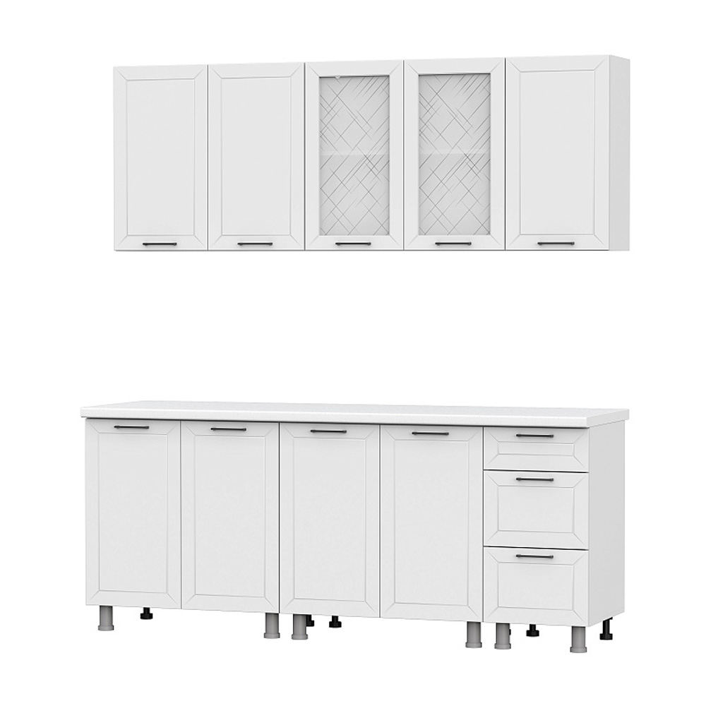 Готовая кухня Вектор - компактное и функциональное решение для вашего дома. Кухонный гарнитур сочетает в себе современный минимализм, эргономичность и надежность. Особенности: — Материал корпуса: ЛДСП — Материал фасада: МДФ / Стекло — Направляющие ящиков: Шариковые — Максимальная нагрузка на ящик: 5 кг — Максимальная нагрузка на полку: 10 кг — Столешница комплектацией не предусмотрена