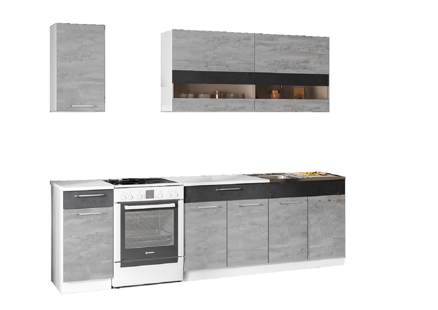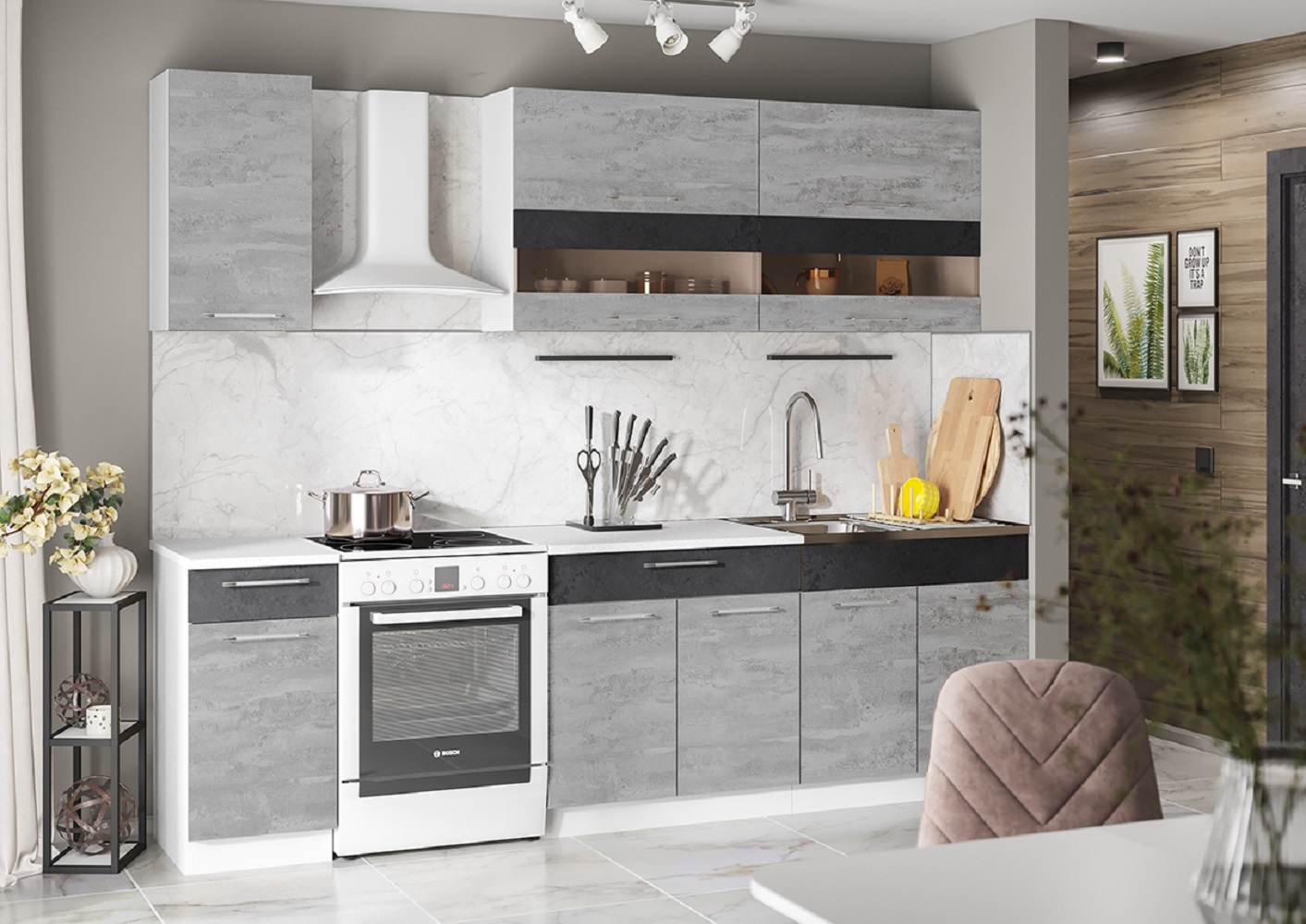 Гарнитур Маша шириной 2.0 м спроектирована для тех хозяек, которые мечтают готовить на удобной и стильной кухне. Верхние модули: ШВ 800, ШВ 800, ШВ 400 - (ВхГ) 71.5х30 см. Нижние модули: ШНМ 800, ШН1Я 800, ШН1Я 400 - (ВхГ) 84.5х52 см (высота указана с учётом столешницы) Декор столешницы - Антарес 26 мм. Особенности материал ЛДСП роликовые направляющие на ящиках пластиковые ручки стекло тонированное 4 мм