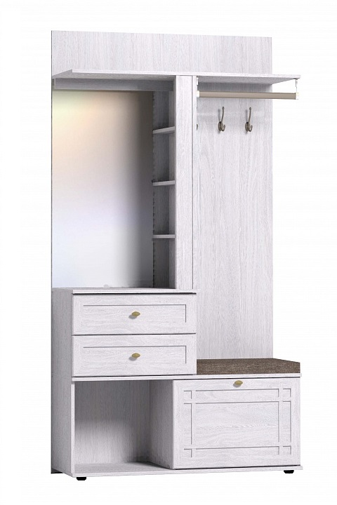 Шкаф МЦН Шерлок 70 - прекрасное решение для организации хранения в малогабаритной прихожей. Несмотря на компактный размер, 112 см в ширину и 40 в глубину, в модели сочетается все необходимое для грамотного планирования входной зоны. Открытая вешалка с крючками и стационарной штангой, полки и ниши за глухими фасадами, ящики и зеркало с подсветкой, которая включается при помощи аккуратного кнопочного выключателя.Штанга выдерживает нагрузку до 25 кг. Уличную и домашнюю обувь Вы сможете разместить в открытой секции под ящиками и закрытой нише за откидной дверцей. Мягкое сиденье входит в комплект и добавляет комфорта при ежедневных сборах на улицу. Шерлок 70 имеет универсальную сборку и может собираться как на левую, так и на правую сторону. Особенности ЛДСП 16 мм, профиль МДФ, кромка ПВХ зеркало 4 мм, проклеенное специальной защитной пленкой декор "ясень анкор светлый" с древесной текстурой шариковые направляющие полного и бесшумного выдвижения на ящиках встроенная подсветка регулируемые опоры, скрывающие нер
