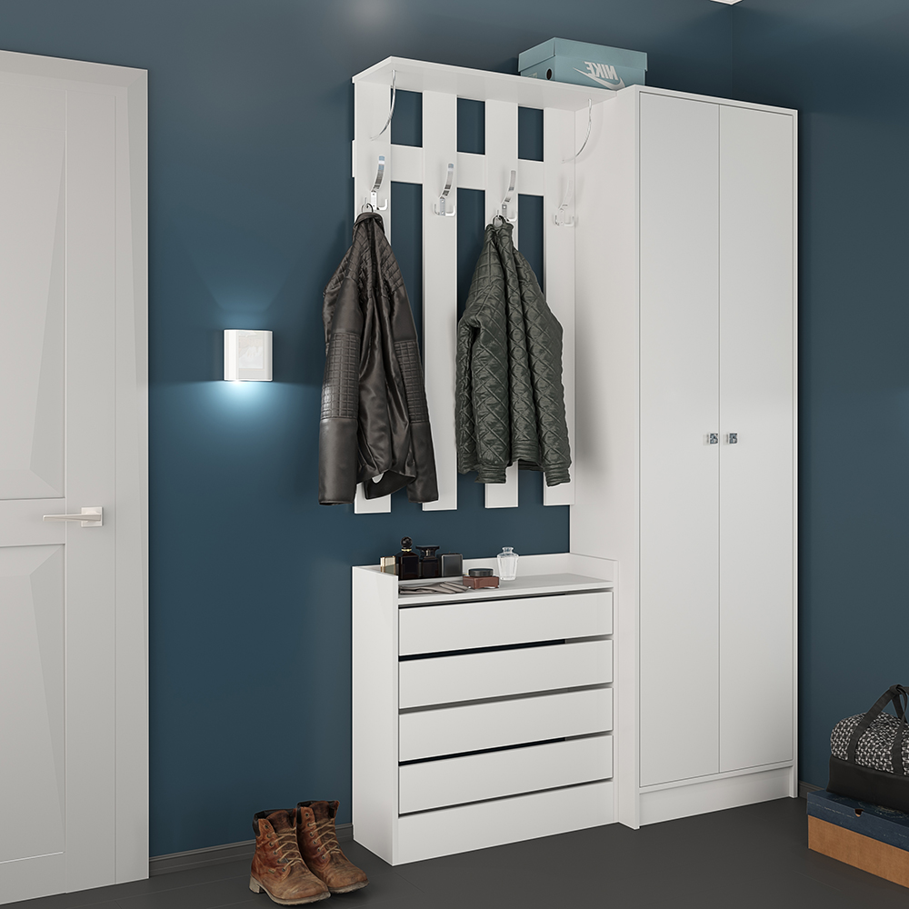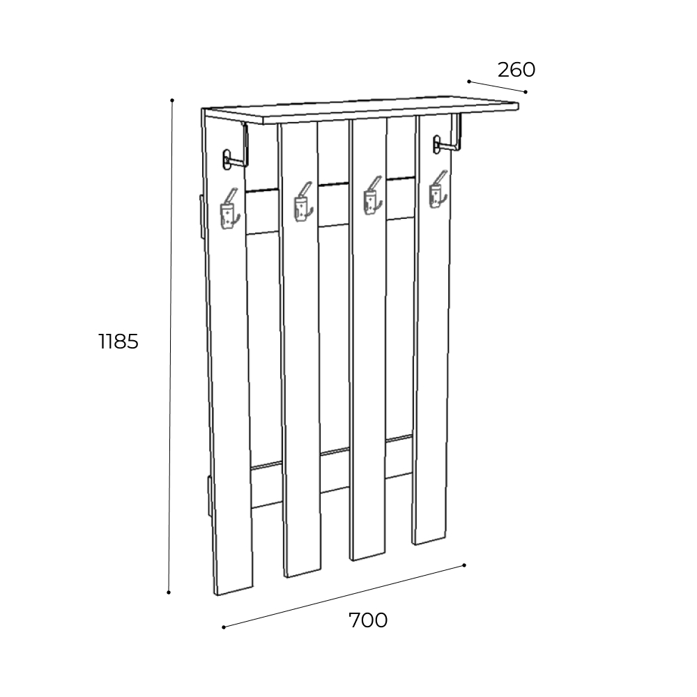 В поисках практичнойвешалки для Вашей прихожей обратите внимание на модель из коллекции Ямайка. Вешалка состоит из панелей ЛДСП, соединенных между собой надежными креплениями, 4-х крючков и открытой полки-антресоли. Это отличное решение для малогабаритных помещений, где не хватит места полноценной системе хранения. Вешалка подойдет для верхнейодежды ежедневной носки. Особенности простота конструкции надежные крепления 4 прочных крючка трендовый декор
