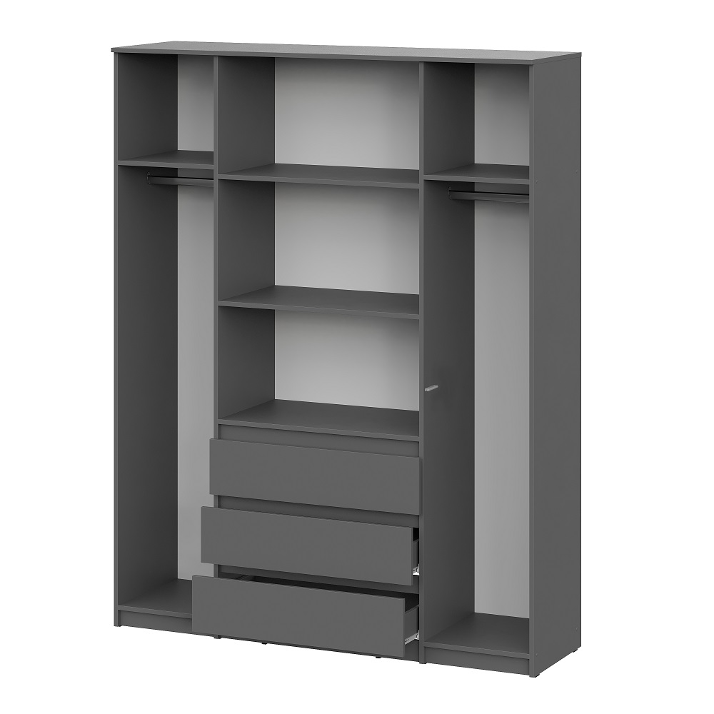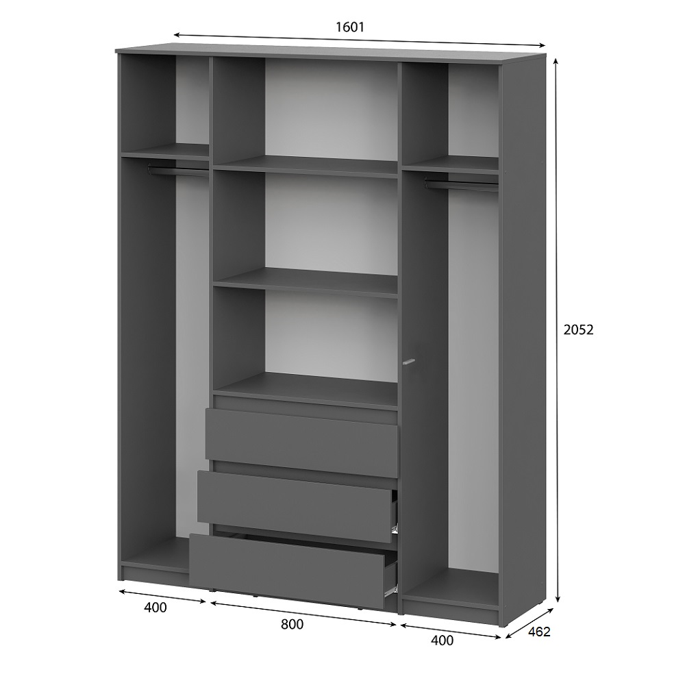 Вместительный распашной шкаф Денвер в цвете графит серый – это идеальное место хранения. Главное преимущество этого шкафа для одежды - его размер и наличие трех выдвижных ящиков. В нем вы сможете найти место для каждой вещи - от платьев до курток, от белья до обуви. Благодаря широким отделениям, вы сможете легко разделить вашу одежду по категориям и поддерживать порядок внутри. Распашные двери обеспечивают удобный доступ к вашей одежде. Три выдвижных ящика помогут легко и быстро найти нужное. Шкаф Денвер оснащен пятью вместительными полками и двумя штангами для одежды, обеспечивая сохранность и презентабельность Ваших вещей. Двери открываются с помощью нажатия. Особенности: — Корпус ЛДСП графит серый — Фасад ЛДСП графит серый — Скрытая фурнитура — Направляющие роликовые — Штанга – 2 шт. — Фурнитура в комплекте — Нагрузка на ящики 5 кг. — Гарантия 24 месяца