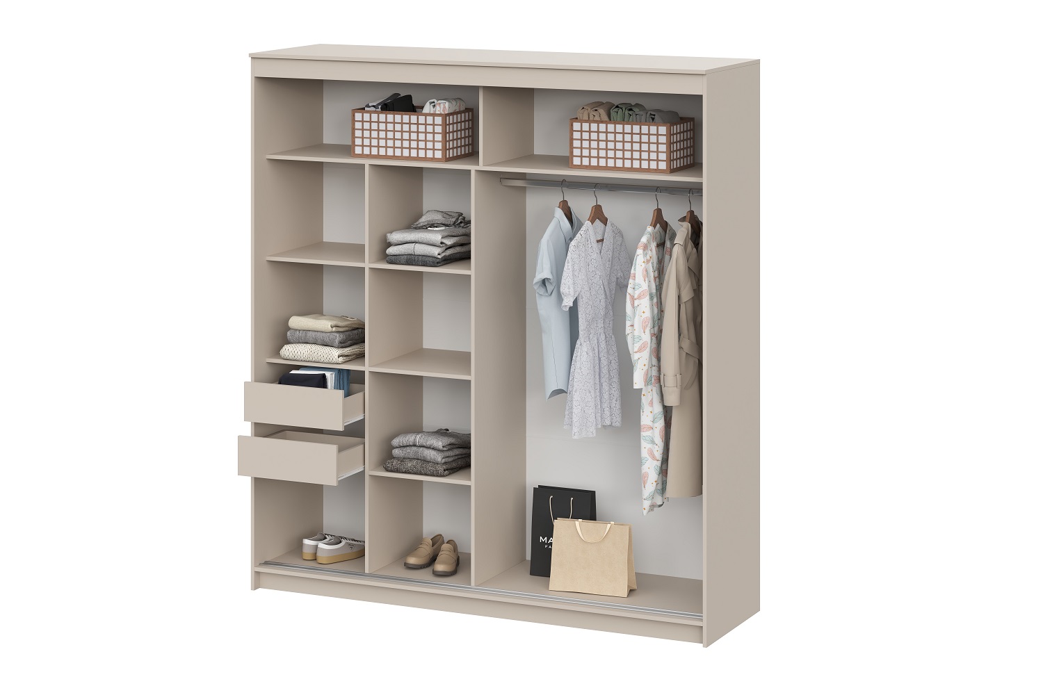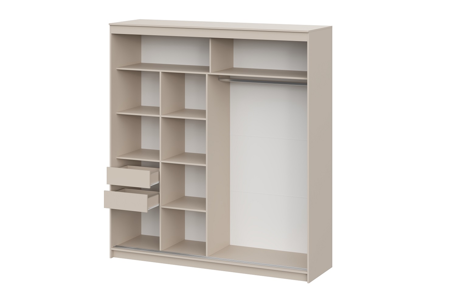 Шкаф-купе №3 — это вместительный и эргономичный шкаф, который станет удобным местом для хранения вещей и стильным элементом интерьера гостиной или спальной комнаты. Его светлые фасады, укрытые стеклом, и огромная зеркальная панель с фацетом визуально расширяют пространство, легко сливаясь в композицию с окружающей мебелью. Внутреннее наполнение шкафа включает удобные полки и два выдвижных ящика с одной стороны, а также вместительную платяную секцию с надёжной металлической штангой для одежных вешалок за другой створкой. Нижнеопорная система раздвижных створок обеспечивает лёгкое и ровное открытие. При создании шкафа использовались экологически безопасные и качественные материалы и фурнитура, что гарантирует долгий срок службы и удобство в эксплуатации. Используемые материалы - ЛДСП. Фасады - Зеркало.