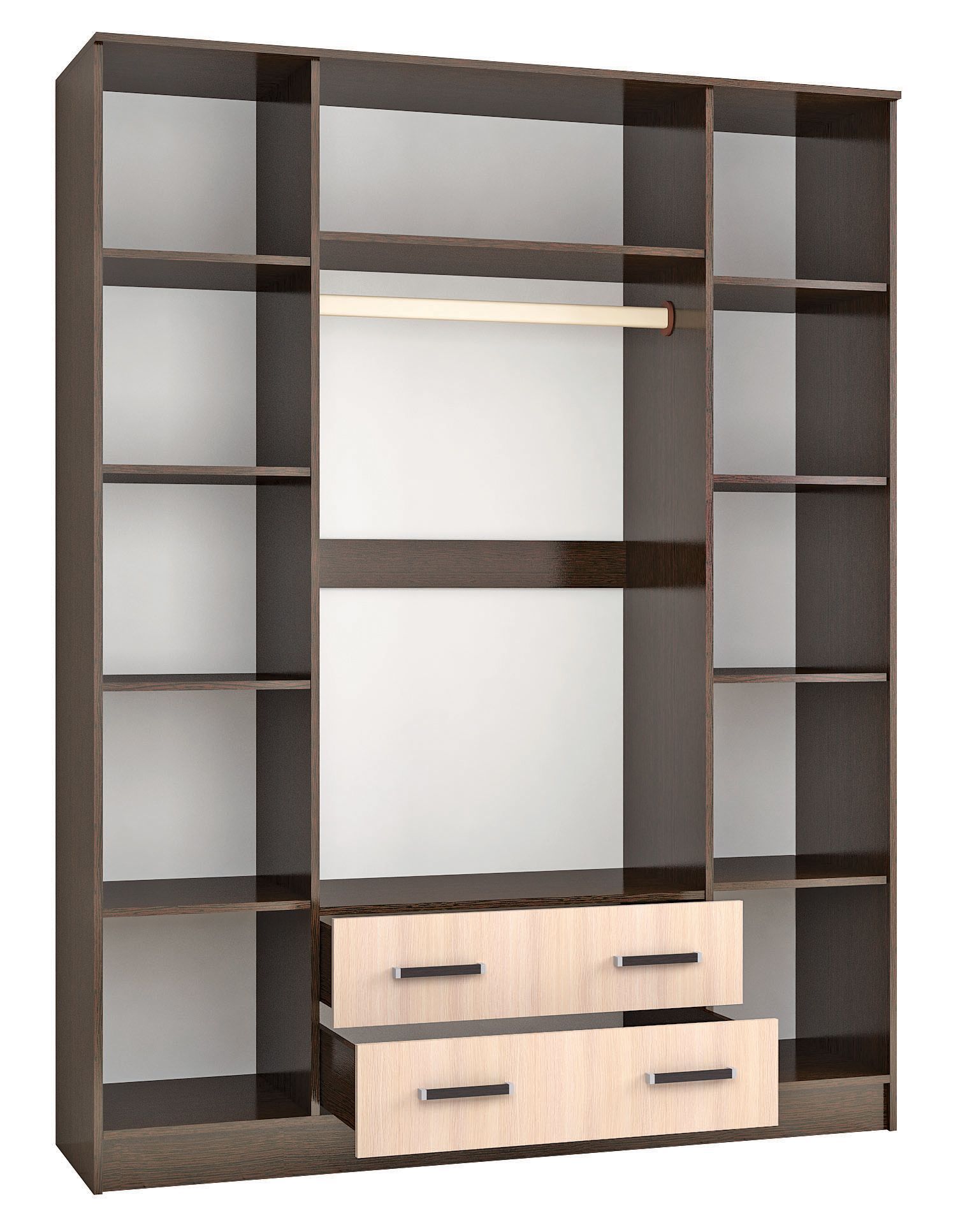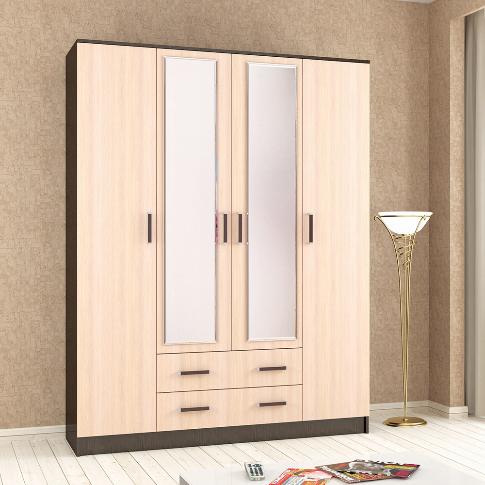 Шкаф комбинированный Лагуна шириной 160 см оснащен двумя зеркалами, полками, платяным отделом и выдвижными ящиками. Организуйте место хранения одежды, белья, аксессуаров в одном месте. Благодаря гармоничным пропорциям и универсальному дизайну шкаф будет гармонично смотреться с современной обстановке. Особенности корпус ЛДСП венге фасад ЛДСП дуб молочный направляющие металлические, роликовые «Boyard» петли без доводчика «Boyard» опоры пластиковые ручки пластиковые