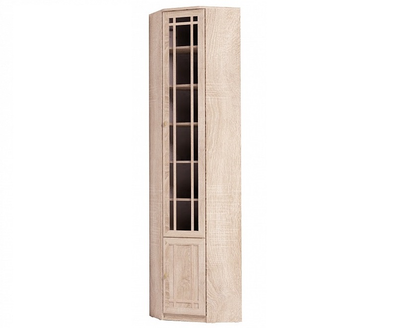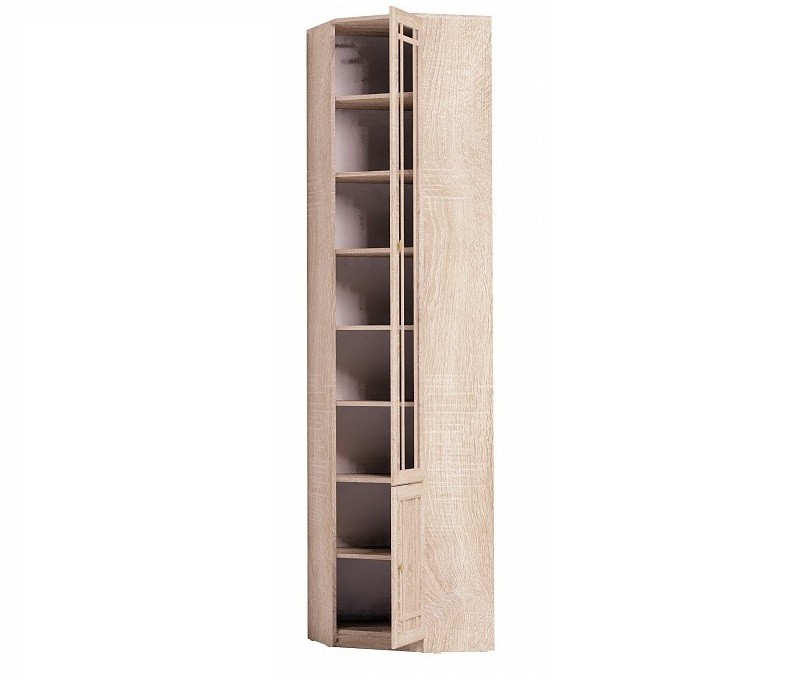 Угловой книжный шкаф - практичное решение для малогабаритных гостиных, библиотек или рабочих кабинетов, где каждый свободный сантиметр важно использовать рационально. Конструкция и габариты шкафа позволят Вам организовать полноценную зону для бережного хранения литературы и сопутствующих вещей. Модуль возможно установить в комнате, высота полотка которой не менее 240 см. Наполнение - комплект регулируемых по высоте полок. Фасад шкафа декорирован тонированным стеклом, свойства которого защитят Ваши книги от вредного воздействия лучей света и загрязнений. Шкаф для книг Шерлок 33 обязательнокрепится к стене за подвесы и межсекционной стяжкой с другими шкафами в комплекте. Особенности ЛДСП 16 мм, кромка ПВХ рамочные фасады из профиля МДФ тонированное стекло 4 мм декор "дуб сонома" комплект регулируемых по высоте полок обязательное крепление к стене за подвесы