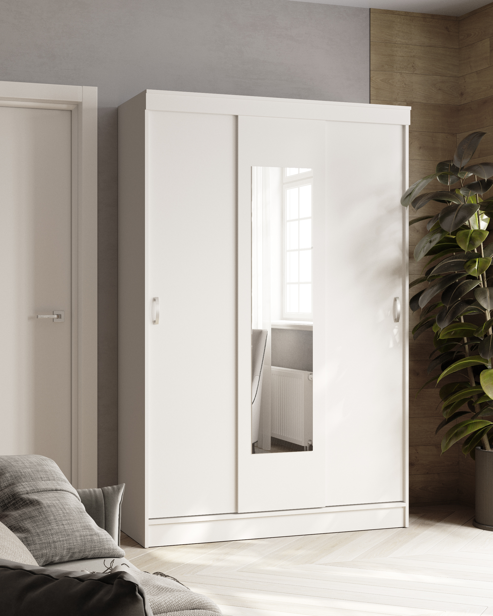 Практичный и универсальный шкаф Бася для хранения одежды в современном интерьере. Выполнен в светлом оттенке «белое дерево», который визуально расширяет пространство и легко сочетается с любой мебелью. Фасады изготовлены из ЛДСП с зеркальной вставкой, корпус — из прочного ЛДСП. Поверхность матовая, без глянца, что делает внешний вид более спокойным и не марким. Шкаф оснащен тремя дверями, внутри предусмотрена горизонтальная штанга для одежды и полки для хранения вещей. Зеркало на фасаде добавляет функциональности и избавляет от необходимости устанавливать отдельное. Особенности: — Материал корпуса: ЛДСП — Материал фасада: ЛДСП — Штанга для белья в комплекте — Горизонтальная штанга для одежды — Наличие полок — Ручки в комплекте — Без ящиков и открытых полок — Без ножек (устанавливается на основание) — Зеркало крепится самостоятельно (скотч, кляймеры) — Рекомендуется дополнительно использовать монтажный клей («жидкие гвозди»)