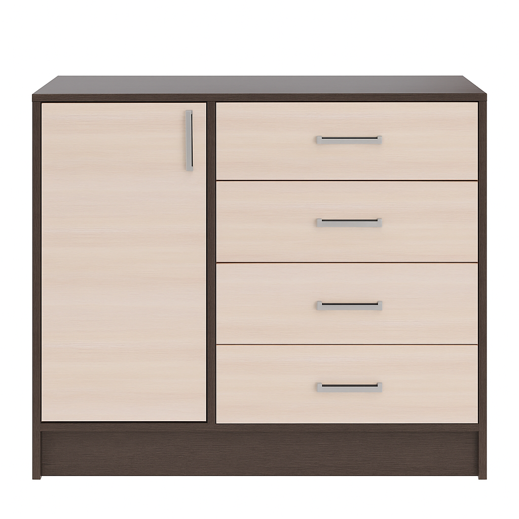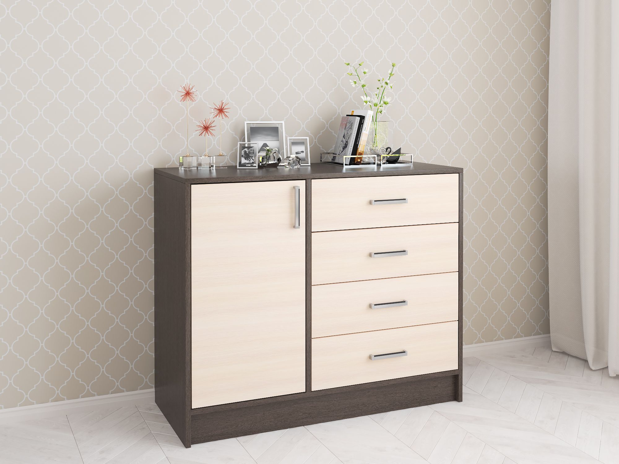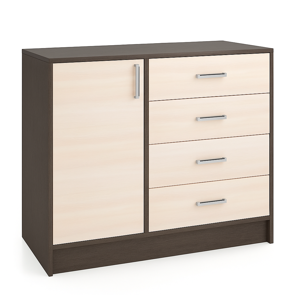 Комод Катрин-6 — Комод с двумя секциями: отделение с распашным фасадом и выдвижные ящики — Выдвижные ящики установлены на роликовых направляющих — Максимальная распределенная нагрузка для выдвижных ящиков на дно — 8-10 кг Материал:ЛДСП. Paзмеры:830х1000х425 Вес 49 кг
