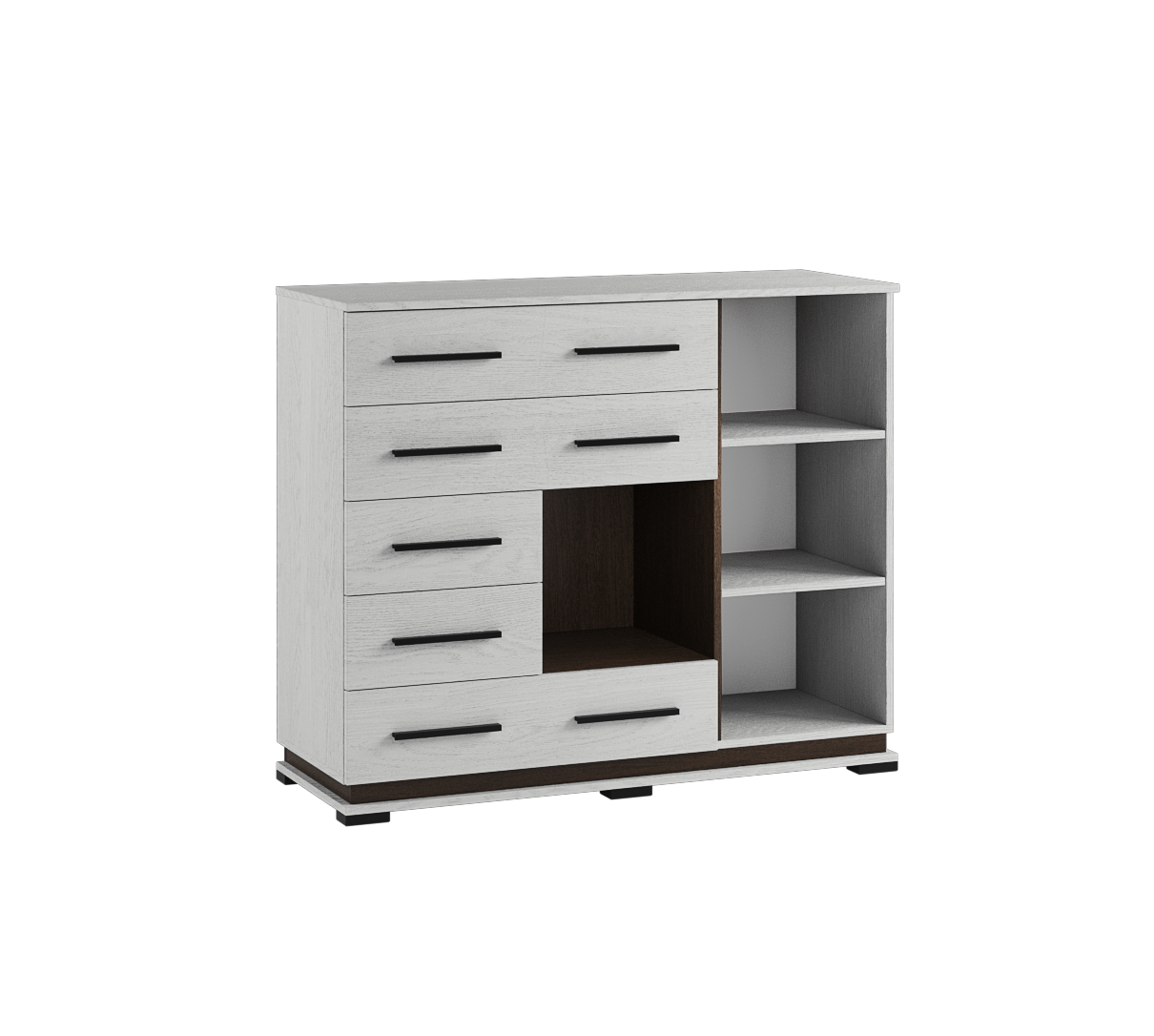 Одним из самых полезных по функционалу модулей в коллекции Модена выступает комод МК-2. Комод имеет столешницу шириной 120 см, на которой Вы с комфортом разместите книги, предметы декора и памятные вещицы. Комплект ящиков пригодится для хранения различных вещей: журналов, небольших коробок, домашней мелочовки. Открытая ниша в центре комода цвета венге пригодится для тех предметов, которые нужно иметь под рукой. Секция за дверцей с полками подарит дополнительное пространство для хранения. Особенности: трендовый стиль сочетание древесного декора с темными деталями из МДФ нейтральное цветовое решение - ясень анкор светлый четкость форм и линий фурнитура европейского качества шариковые направляющие полного выдвижения на ящиках петли с доводчиками для бесшумного закрывания