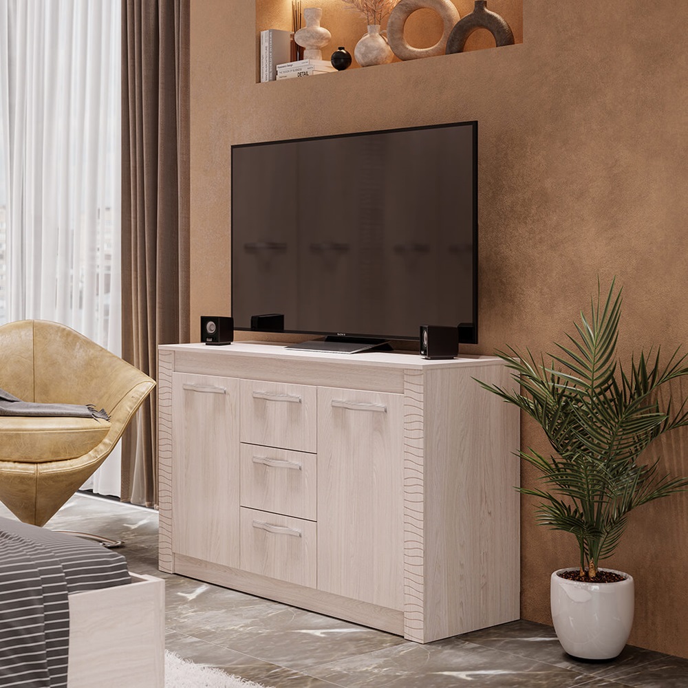 Комод «Монако КМ-14» в цвете «ясень белый F12» — это стильный и функциональный элемент интерьера. Он изготовлен из высококачественных материалов: корпус и фасад — из ЛДСП, а декоративные вставки — из МДФ. Комод имеет три выдвижных ящика и две распашные дверцы. Описание: Размер, мм: 1360х850х460 Материал: ЛДСП с декором из МДФ Цвет: Ясень белый Особенности: приятный дизайн хорошая вместимость шариковые направляющие на ящиках