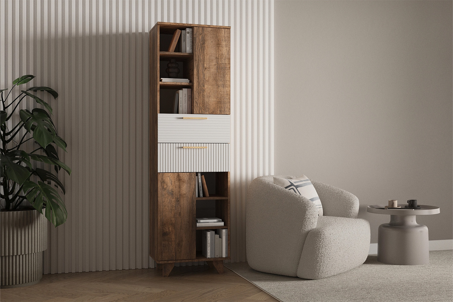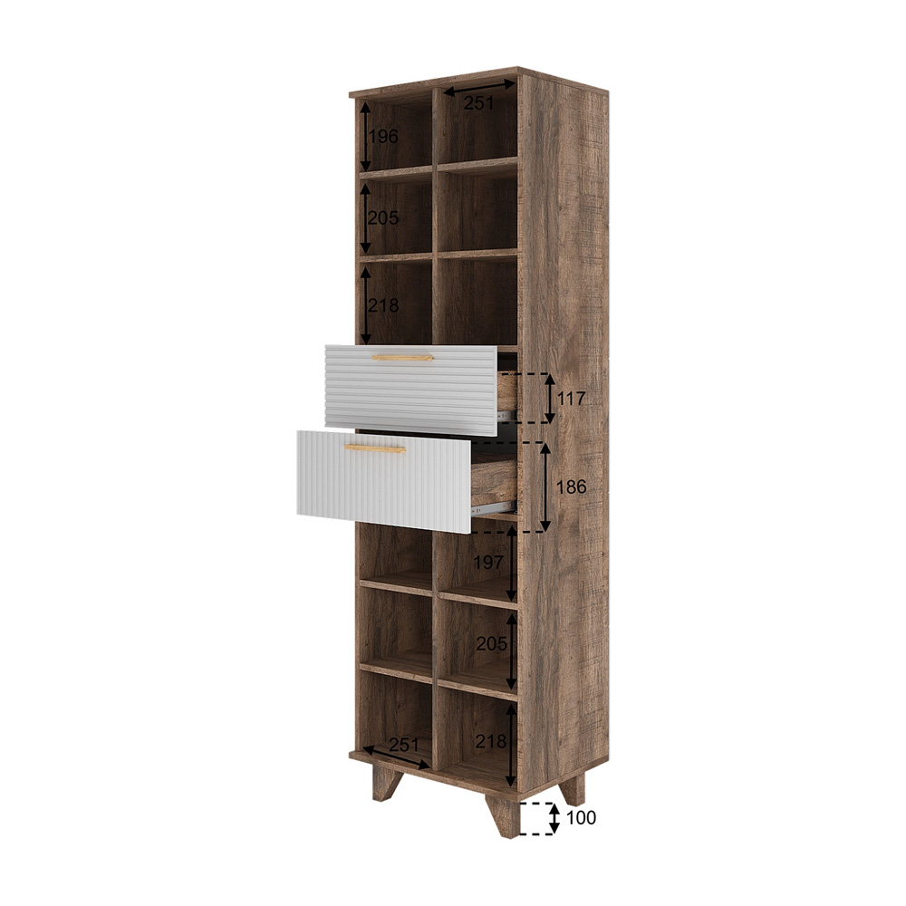 Стеллаж Ньёрд станет отличным решением для организации пространства, предоставляя место для книг, папок с документами, предметов декора и разнообразных учебных принадлежностей. Открытая конструкция с полками добавляет функциональности, а распашные дверцы позволяют удобно хранить более ценные вещи. Особенности: - Материал каркаса: ЛДСП - Материал фасада: МДФ - Способ открывания: Push-to-open - Направляющие ящиков: Шариковые - Максимальная нагрузка на полку: 5 кг - Максимальная нагрузка на ящик: 5 кг - Высота ножек/опор: 10 см