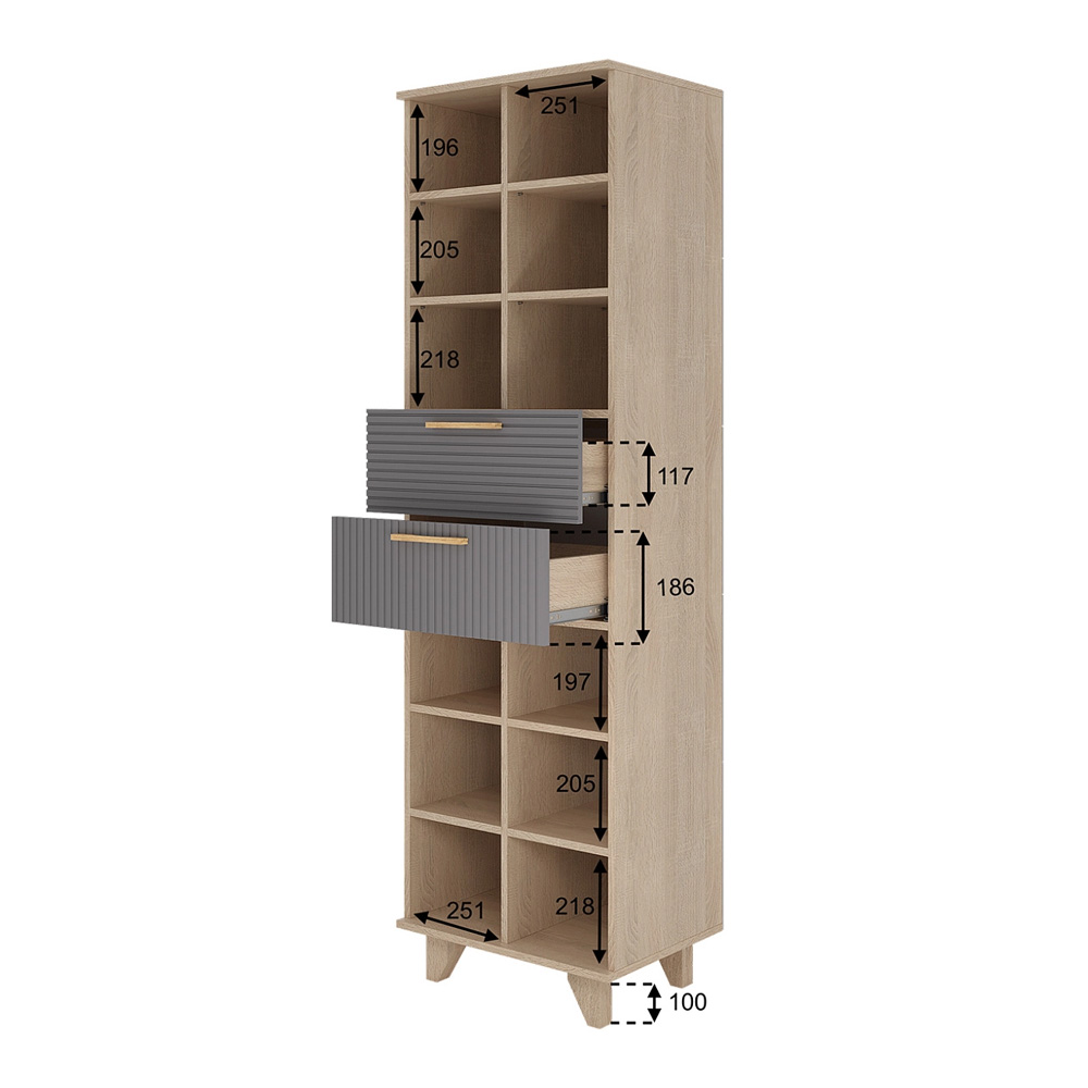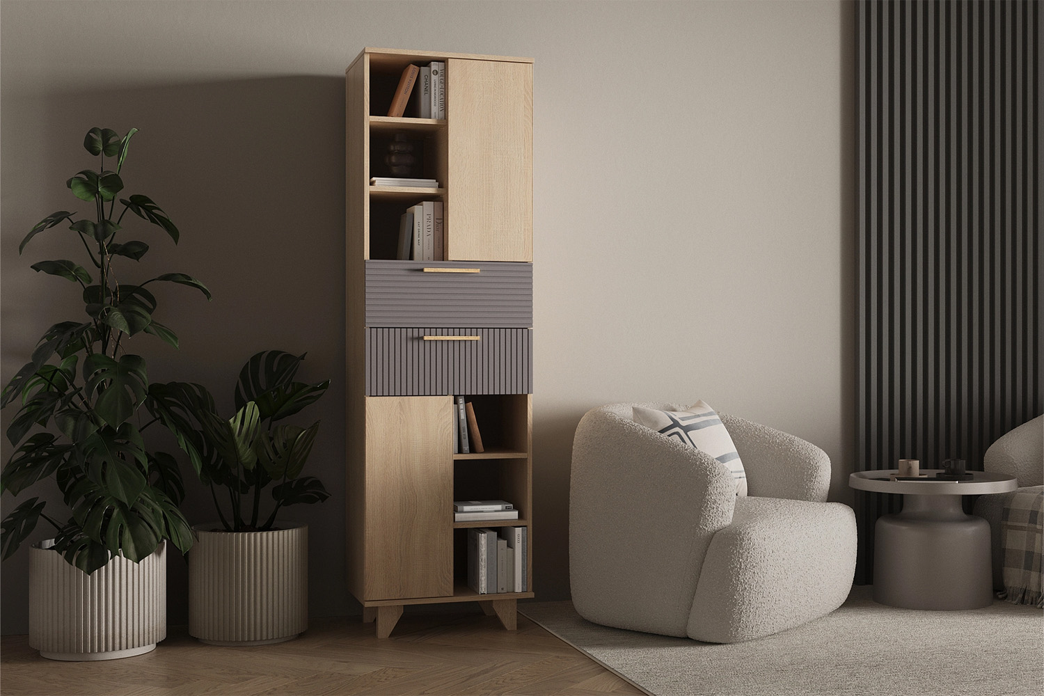 Стеллаж Ньёрд станет отличным решением для организации пространства, предоставляя место для книг, папок с документами, предметов декора и разнообразных учебных принадлежностей. Открытая конструкция с полками добавляет функциональности, а распашные дверцы позволяют удобно хранить более ценные вещи. Особенности: - Материал каркаса: ЛДСП - Материал фасада: МДФ - Способ открывания: Push-to-open - Направляющие ящиков: Шариковые - Максимальная нагрузка на полку: 5 кг - Максимальная нагрузка на ящик: 5 кг - Высота ножек/опор: 10 см