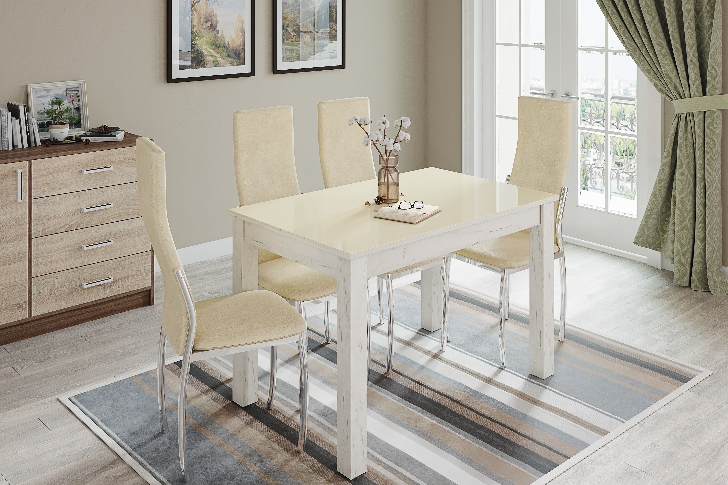 Обеденный стол Норман по достоинству оценят любители качественной и привлекательной мебели. Столешница изготовлена из ЛДСП и покрыта стеклом в декоре "лакобель ваниль". Имеет скругленные углы, что не только визуально привлекательно, но и безопасно для ежедневного использования. Опоры из МДФ облицованы высококлассной финиш-пленкой цвета "дуб крафт белый". Цвет стола визуально освежит интерьер Вашей кухни и будет гармонировать с мебельным гарнитуром. Особенности стеклянная столешница в декоре "лакобель ваниль" надежные ножки из МДФ с древесным декором стандартный размер для кухни нераскладная модель