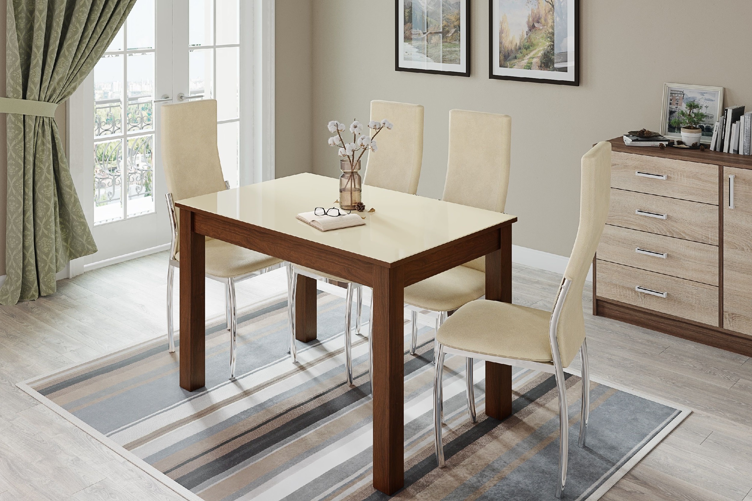 Обеденный стол Норман по достоинству оценят любители качественной и привлекательной мебели. Столешница изготовлена из ЛДСП и покрыта стеклом в декоре "лакобель ваниль". Имеет скругленные углы, что не только визуально привлекательно, но и безопасно для ежедневного использования. Опоры из МДФ облицованы высококлассной финиш-пленкой цвета "орех шоколадный". Сочетание светлой столешницы и темных ногвыглядит контрастно, но стильно. Особенности стеклянная столешница в декоре "лакобель ваниль" надежные ножки из МДФ с древесным декором стандартный размер для кухни нераскладная модель