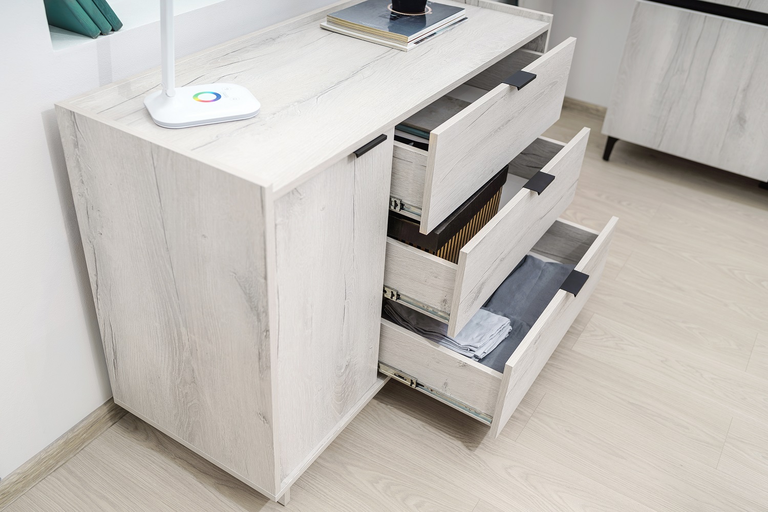 Современная ФЛЕКС 5 Тумба МЦН в светлом цвете Дуб Шавиниган выполнена из ЛДСП класса эмиссии Е1 толщиной 16 мм. Тумба-комод — это оптимальное решение для хранения предметов разных габаритов и назначения. В выдвижных ящиках разместите мелкие вещи, а в отделении с дверкой — более габаритные. Ящики оснащены шариковыми направляющими полного выдвижения, а дверка с самоклеющимися демпферами тихо закрывается. ФЛЕКС 5 Тумба МЦН разработана с возможностью универсальной сборки, что позволяет расположить дверку как справа, так и слева. Столешница с бортиками идеально подходит, чтобы поставить принтер или телевизор. Бортики по краям защищают предметы от падения со столешницы. ФЛЕКС 5 Тумба МЦН может использоваться как в качестве офисной тумбы, так и как тумба ТВ или комод. Высота (780 мм) и глубина тумбы (450 мм) позволяет сделать её дополнением к ФЛЕКС 15 Стол письменный, расширив, тем самым, рабочую поверхность.