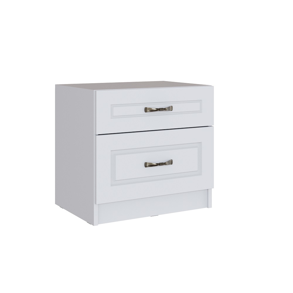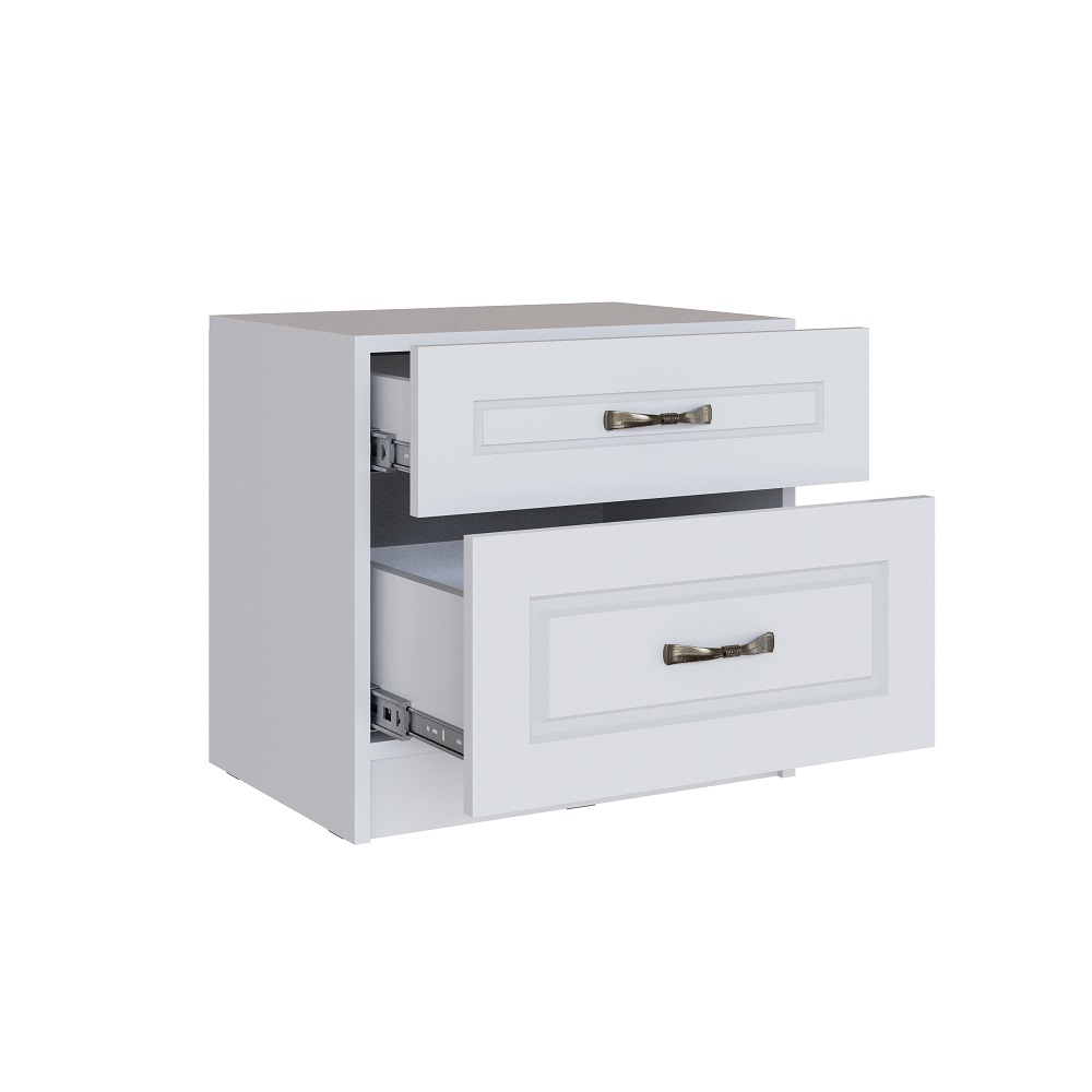 Миниатюрная прикроватная тумба с двумя выдвижными ящиками на плавных направляющих. Особенности корпус ЛДСП белый с тиснением «древесные опоры» фасад МДФ в пленке ПВХ «белый дуб» классические ручки компактный размер
