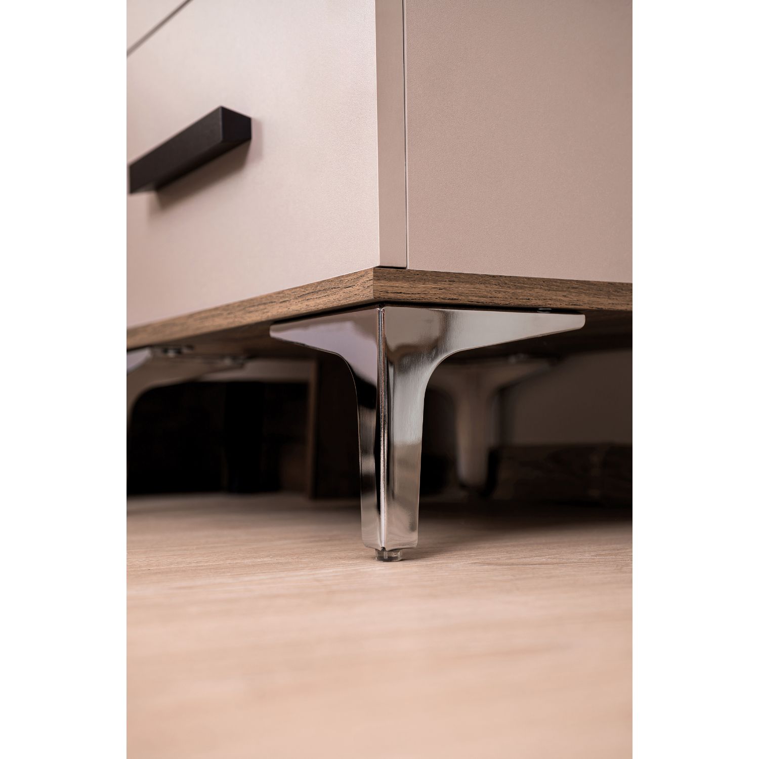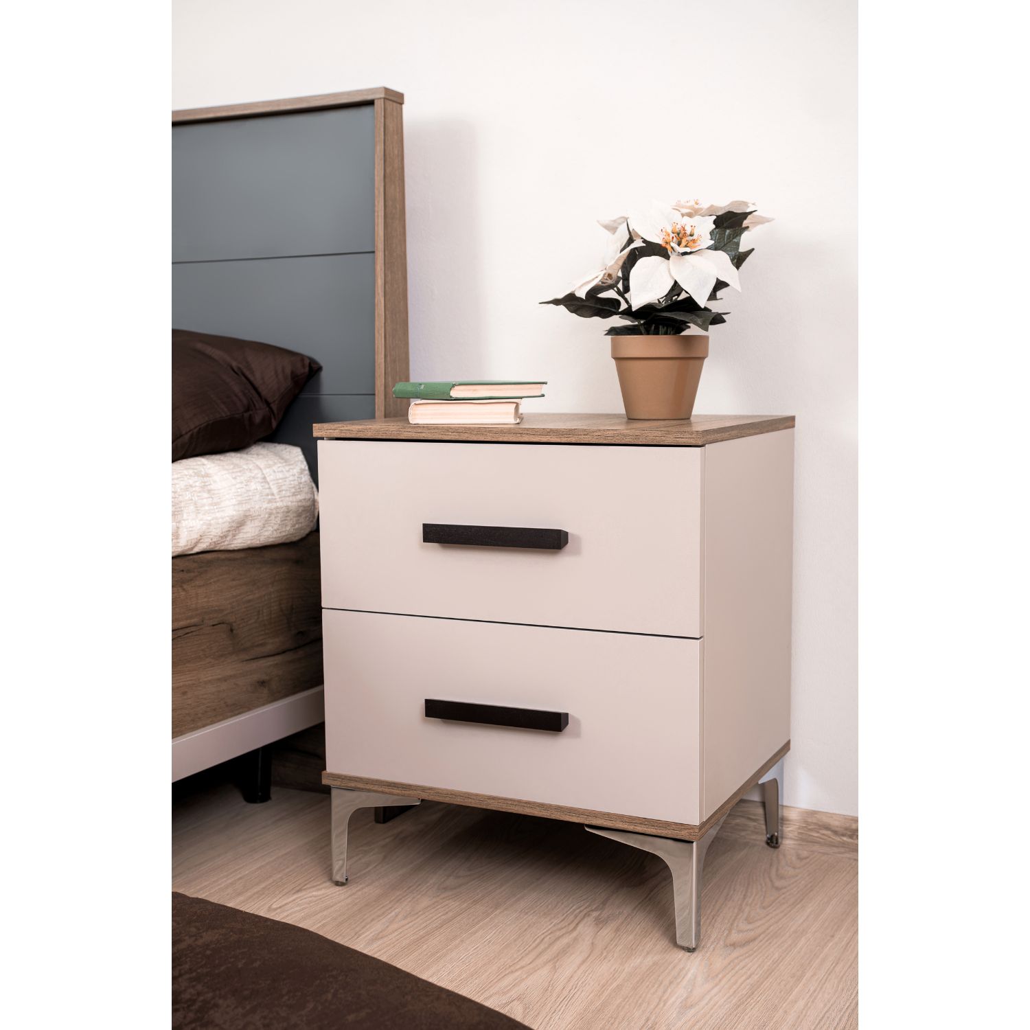 Тумба с двумя ящиками в спальню из коллекции Кара на металлических опорах отлично украсит спальню и добавит уюта. Особенности фигурные металлические опоры 2 выдвижных ящика шариковые направляющие плавного выдвижения низ и столешница из контрастной плиты ЛДСП дуб табачный