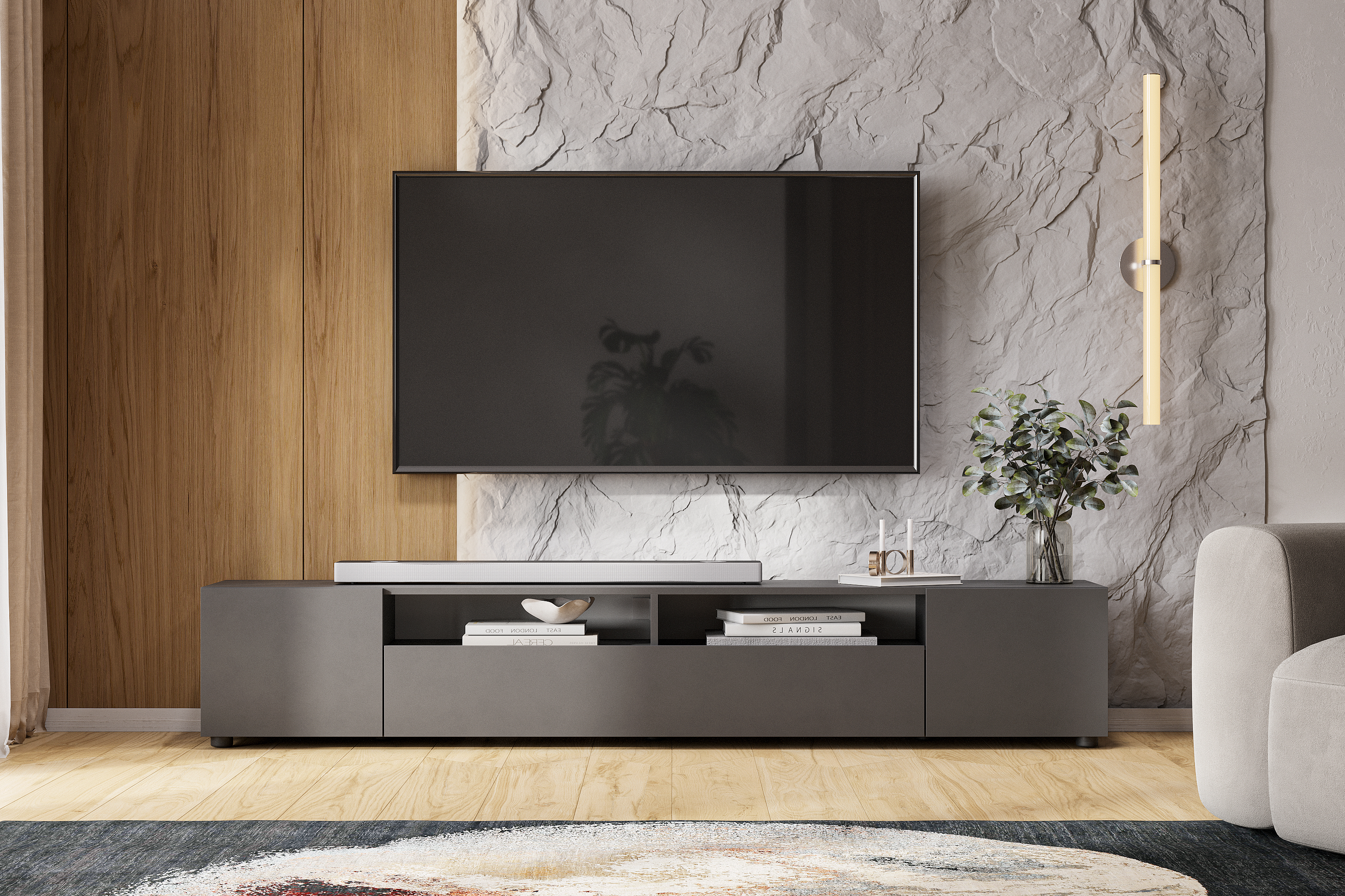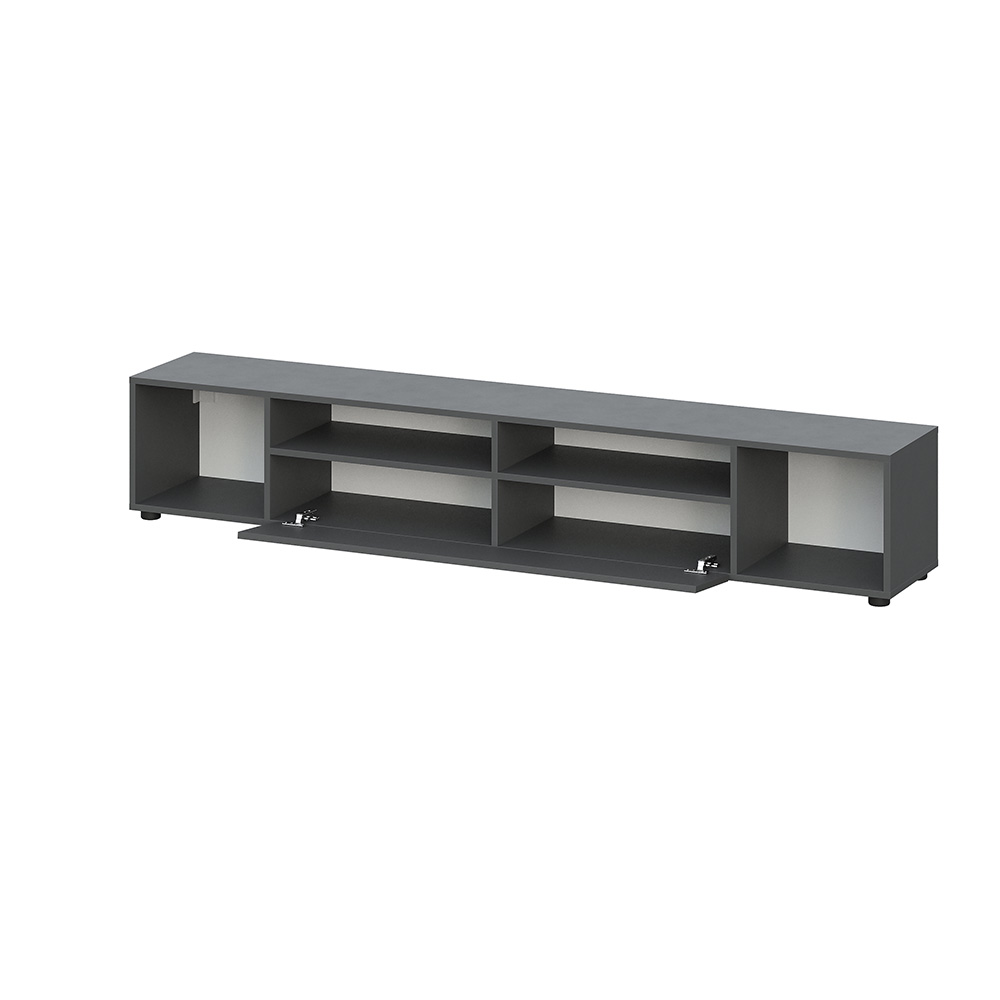 Тумба под ТВ из модульной серии Денвер в цвете графит дополнит гостиную в сочетании со шкафами и навесными полками или навесными шкафами, на выбор. Каркас и фасад выполнены из ЛДСП толщиной 16 мм, что придает ему дополнительную прочность и долговечность. За откидной дверкой расположены две полки и перегородка. Гарантия от производителя составляет 24 месяца.